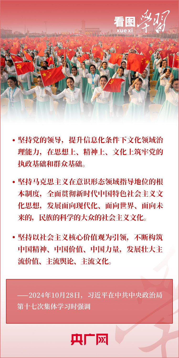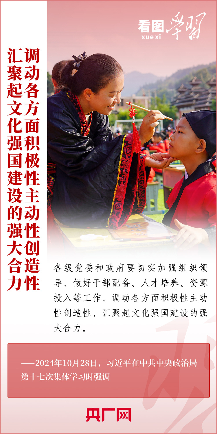 建設(shè)文化強國是全黨全社會的共同任務(wù)。10月28日,中共中央政治局就建設(shè)文化強國進(jìn)行第十七次集體學(xué)習(xí)。習(xí)近平總書記在聽取講解和討論后發(fā)表重要講話,就錨定2035年建成文化強國戰(zhàn)略目標(biāo)作出最新部署,強調(diào)要“不斷發(fā)展具有強大思想引領(lǐng)力、精神凝聚力、價值感召力、國際影響力的新時代中國特色社會主義文化,不斷增強人民精神力量,筑牢強國建設(shè)、民族復(fù)興的文化根基?!币黄饋韺W(xué)習(xí)!