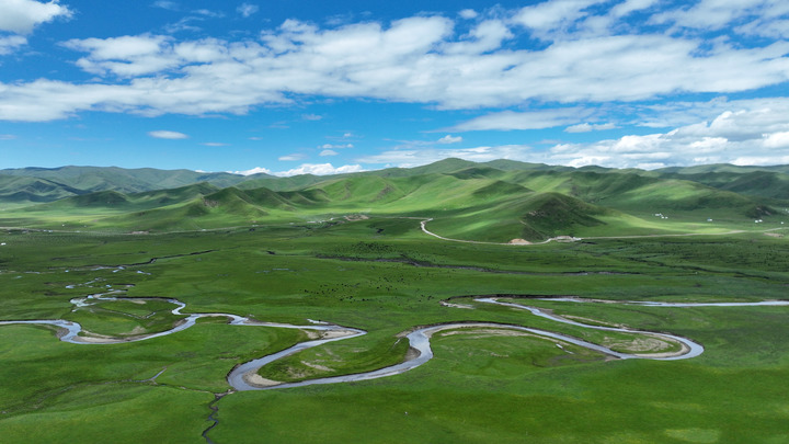 這是2023年7月6日拍攝的甘肅省甘南藏族自治州瑪曲縣阿萬倉濕地景色(無人機照片)。瑪曲縣是黃河上游重要的水源涵養(yǎng)區(qū)和生態(tài)功能區(qū),被稱為“黃河之腎”。多年來,甘肅省實施退牧還草、退化草原生態(tài)修復(fù)等治理工程,草原生態(tài)環(huán)境明顯改善。