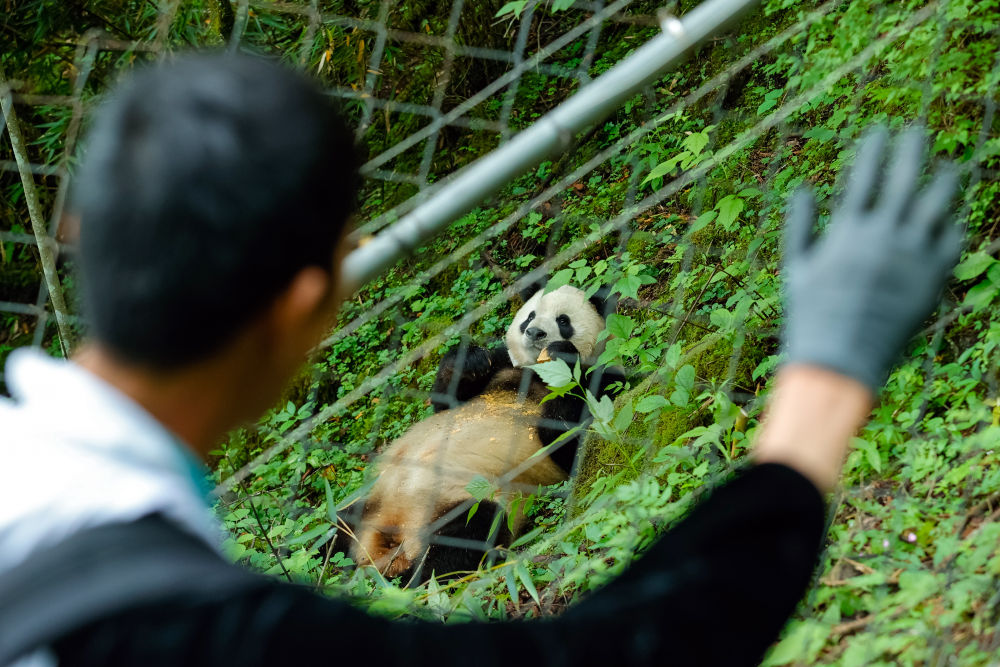2024年6月24日,在位于大熊貓國家公園臥龍片區(qū)內(nèi)天臺山的大熊貓第二階段野化培訓(xùn)場外,工作人員給母熊貓“賢賢”投喂完食物后揮手向其告別。近年來,我國通過大力實施天然林保護、野生動植物保護和大熊貓國家公園建設(shè)等,保護大熊貓及其棲息地,成效顯著。大熊貓野外種群總量已從20世紀80年代的約1100只增長到近1900只。
