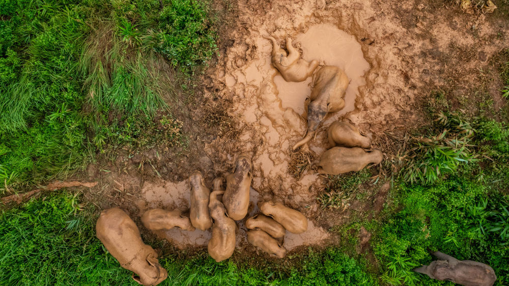 2024年8月8日,“短鼻家族”和“然然家族”的野象在云南省西雙版納州景洪市大渡崗鄉(xiāng)的泥塘里玩耍(無人機照片)。近年來,云南修復(fù)改造了一些大象棲息地,種植大象愛吃的植物,同時運用紅外相機等技術(shù)手段,實現(xiàn)亞洲象位置信息的實時發(fā)布。