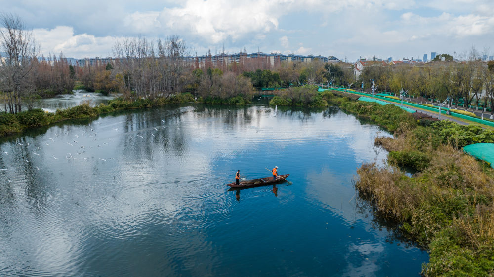 2024年1月16日,管護人員在滇池打撈雜物(無人機照片)。據(jù)昆明市滇池管理局介紹,2023年滇池全湖水質(zhì)持續(xù)向好,自2018年上升為Ⅳ類水質(zhì)后,連續(xù)六年保持全湖水質(zhì)Ⅳ類。