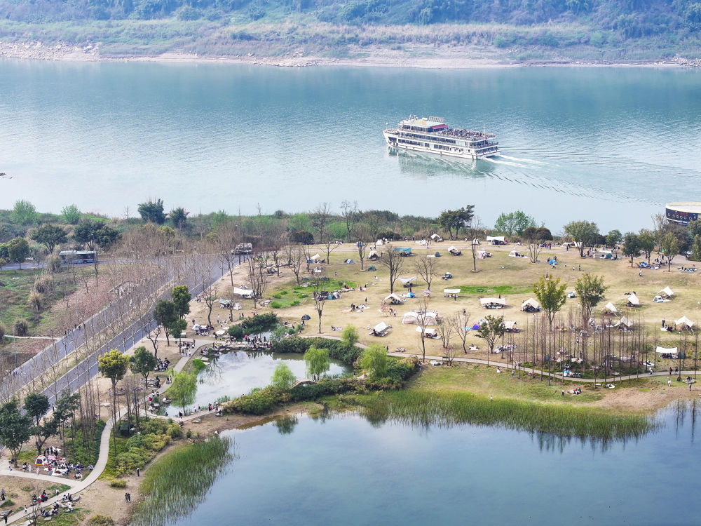 2024年3月16日,游客在重慶廣陽島東島頭一帶游覽、休閑(無人機照片)。廣陽島是長江上游最大的江心島。近年來,當?shù)叵到y(tǒng)推進自然恢復(fù)、生態(tài)修復(fù),豐富生物多樣性。2024年,重慶廣陽島生態(tài)修復(fù)項目成功入選聯(lián)合國“生態(tài)恢復(fù)十年”優(yōu)秀案例。