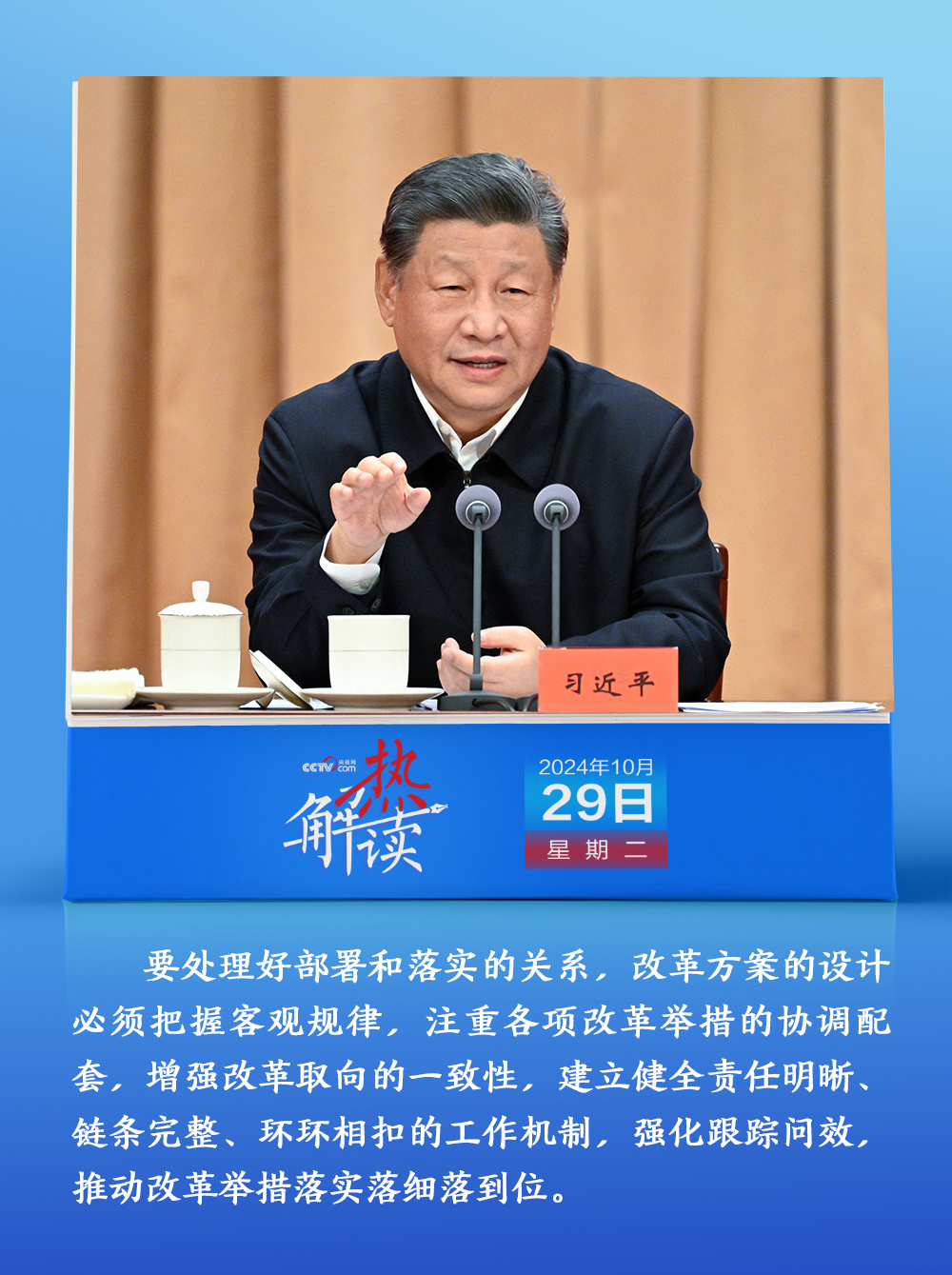 熱解讀10月29日,省部級(jí)主要領(lǐng)導(dǎo)干部學(xué)習(xí)貫徹黨的二十屆三中全會(huì)精神專(zhuān)題研討班開(kāi)班。在開(kāi)班式上,習(xí)近平總書(shū)記明確提出要“處理好部署和落實(shí)的關(guān)系”,“建立健全責(zé)任明晰、鏈條完整、環(huán)環(huán)相扣的工作機(jī)制,強(qiáng)化跟蹤問(wèn)效,推動(dòng)改革舉措落實(shí)落細(xì)落到位”。