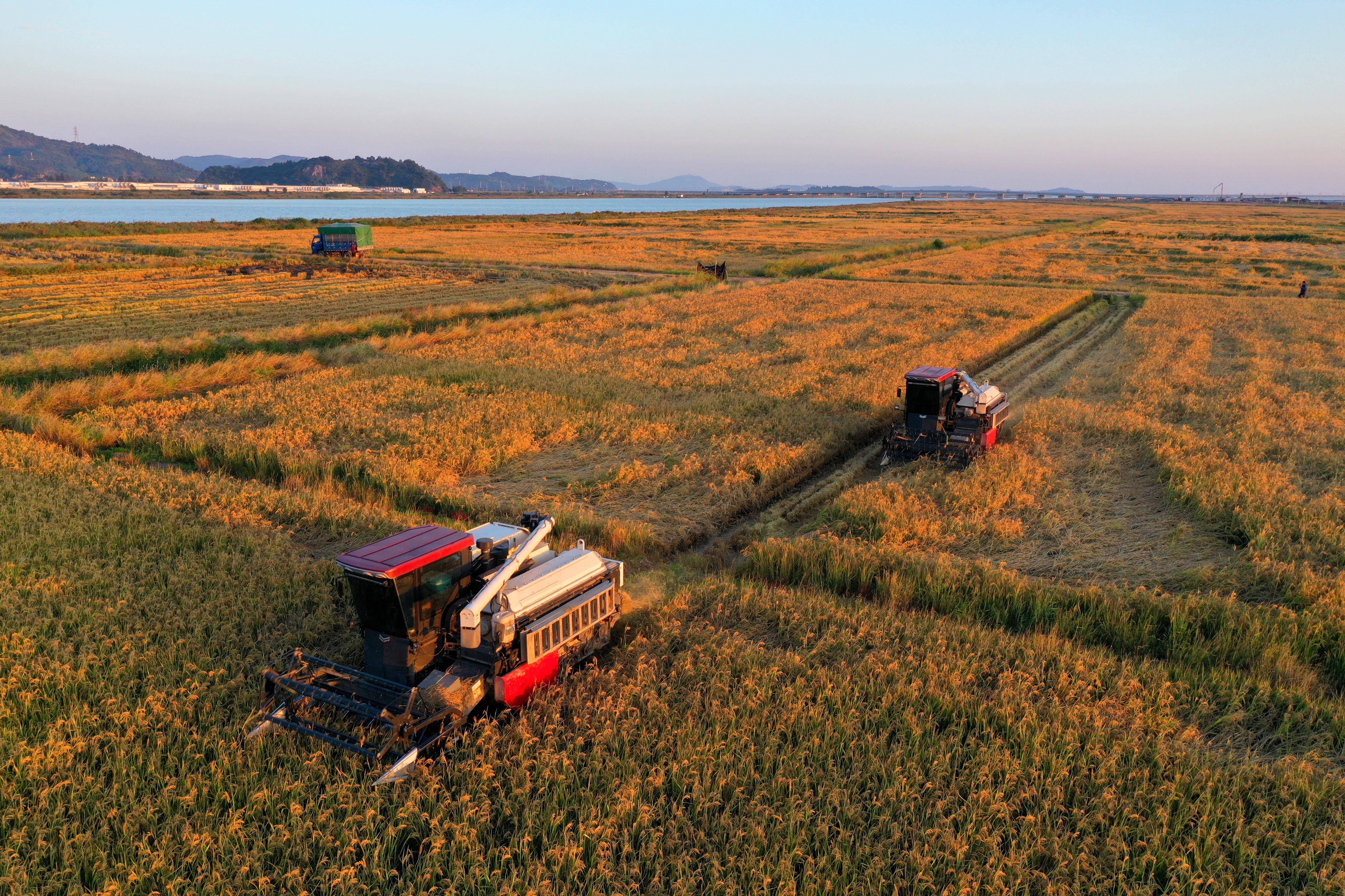 深秋時節(jié),浙江省玉環(huán)市漩門三期智慧農業(yè)示范基地的海水稻迎來豐收,農民駕駛收割機忙著收割。