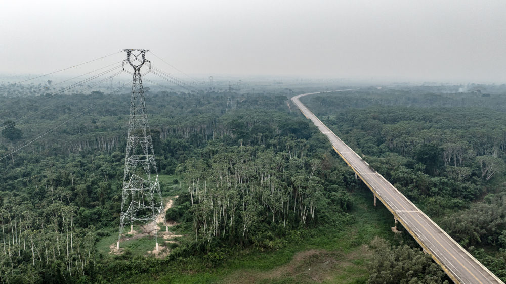 這張9月13日拍攝的照片顯示,在巴西朗多尼亞州,EDP輸變電項目線路穿越熱帶雨林(無人機照片)。巴西EDP輸變電項目是位于巴西北部的阿克里州和朗多尼亞州的綠地輸變電工程,山東電建一公司承擔了該項目的EPC總承包任務。新華社記者王天聰攝