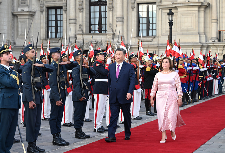當(dāng)?shù)貢r間11月14日下午,國家主席習(xí)近平在利馬總統(tǒng)府同秘魯總統(tǒng)博魯阿爾特舉行會談。博魯阿爾特在總統(tǒng)府前廣場為習(xí)近平舉行隆重盛大歡迎儀式。習(xí)近平在博魯阿爾特陪同下檢閱儀仗隊。新華社記者 謝環(huán)馳 攝