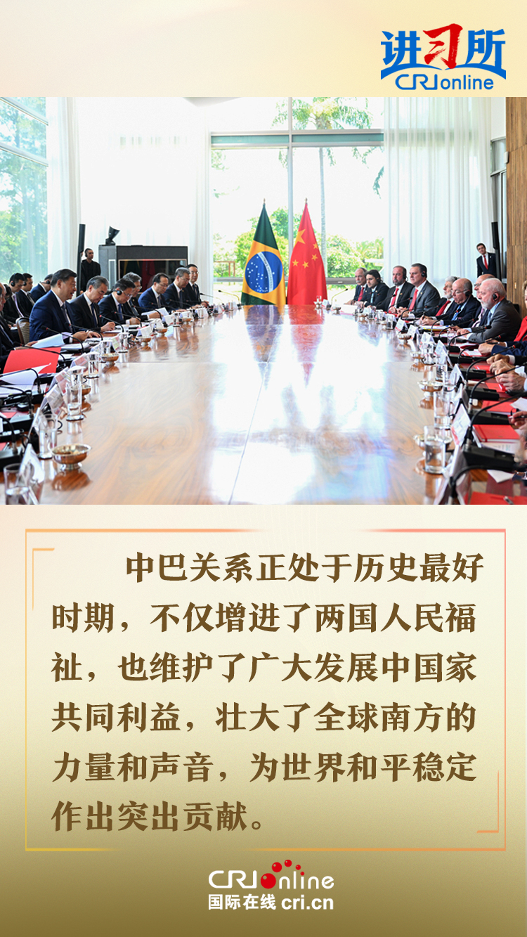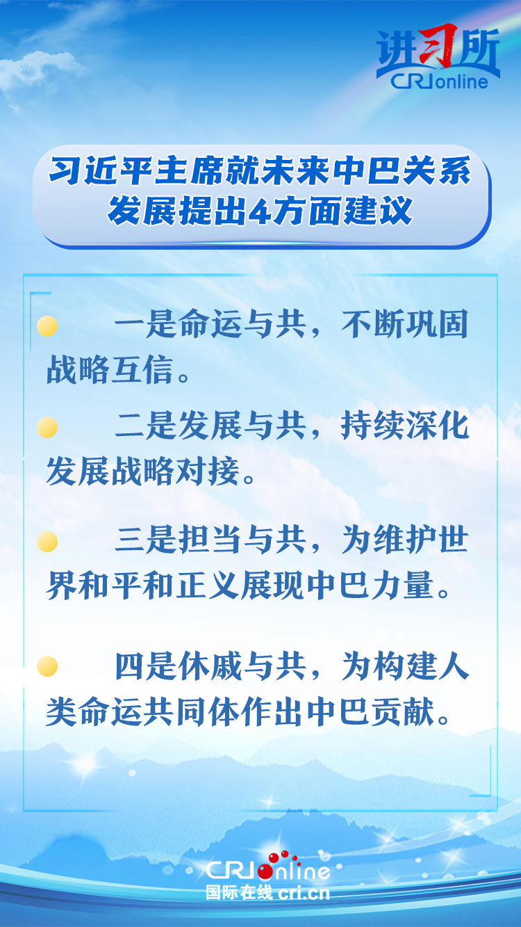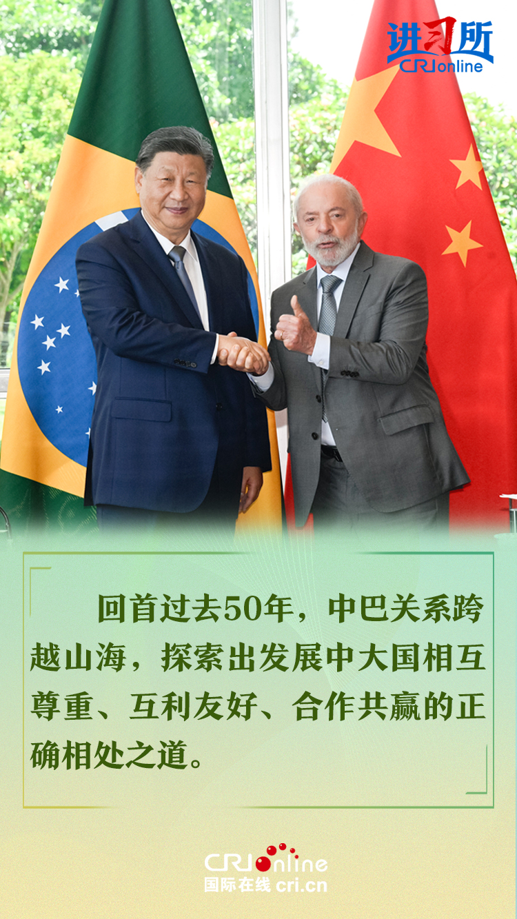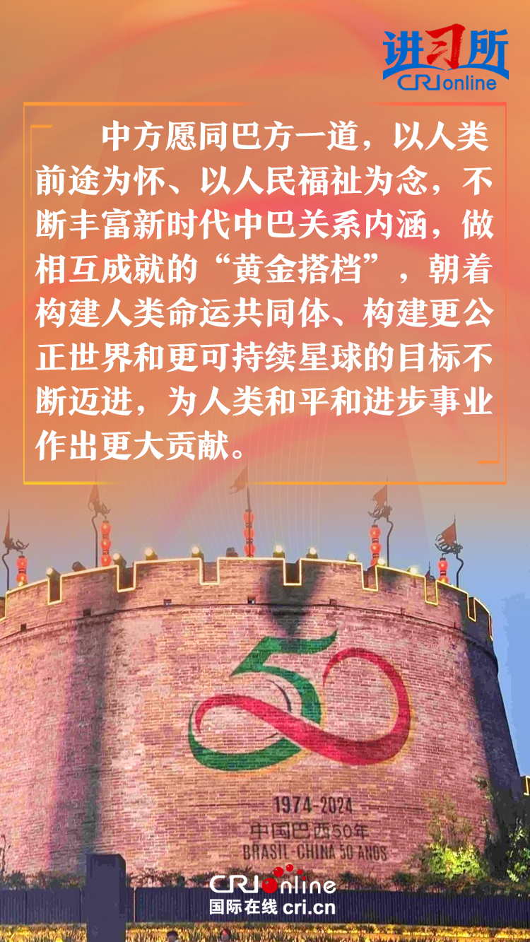 今年是中巴建交50周年。習(xí)近平指出,回首過去50年,中巴關(guān)系跨越山海,探索出發(fā)展中大國(guó)相互尊重、互利友好、合作共贏的正確相處之道。中方愿同巴方一道,以人類前途為懷、以人民福祉為念,不斷豐富新時(shí)代中巴關(guān)系內(nèi)涵,做相互成就的“黃金搭檔”,朝著構(gòu)建人類命運(yùn)共同體、構(gòu)建更公正世界和更可持續(xù)星球的目標(biāo)不斷邁進(jìn),為人類和平和進(jìn)步事業(yè)作出更大貢獻(xiàn)。