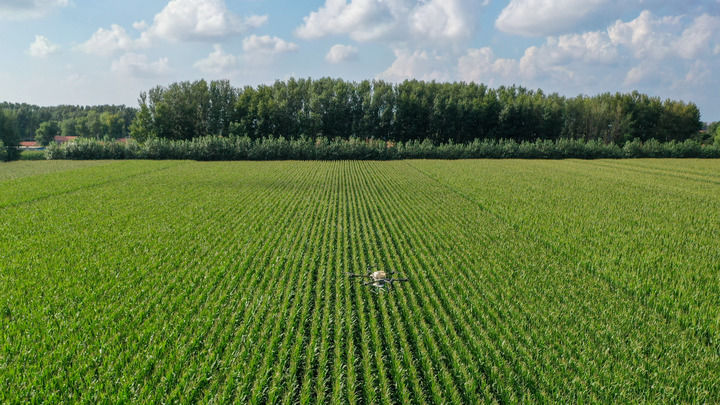 2024年8月8日,在吉林省梨樹(shù)縣孤家子鎮(zhèn),無(wú)人機(jī)為作物施肥(無(wú)人機(jī)照片)。新華社記者 張楠 攝