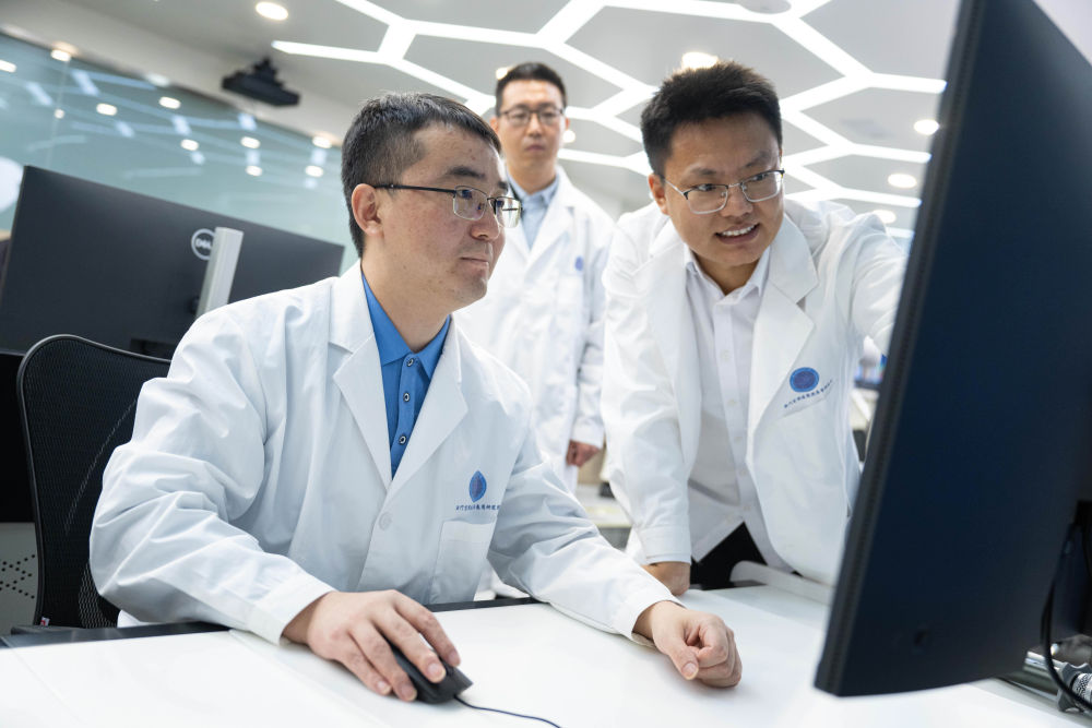 2024年12月4日,“澳科一號(hào)”衛(wèi)星項(xiàng)目助理研究員尹亮(左一)與同事交流。