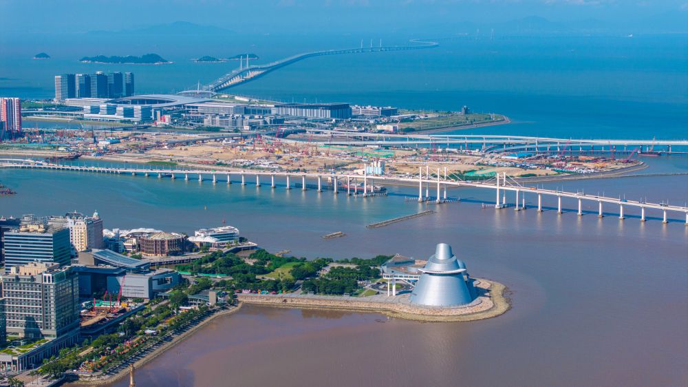 2024年8月3日拍攝的澳門科學(xué)館(前)、澳門新城A區(qū)和港珠澳大橋(后)(無人機(jī)照片)。