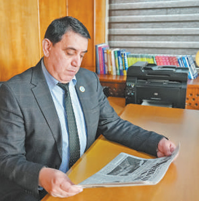蘇赫羅普·勞夫佐達閱讀塔吉克斯坦《人民論壇報》與中國相關的報道。劉帥杰攝