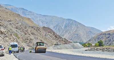 中塔公路二期項目建設現(xiàn)場,兩國工作人員正在平整瀝青路面。本報記者 程是頡攝