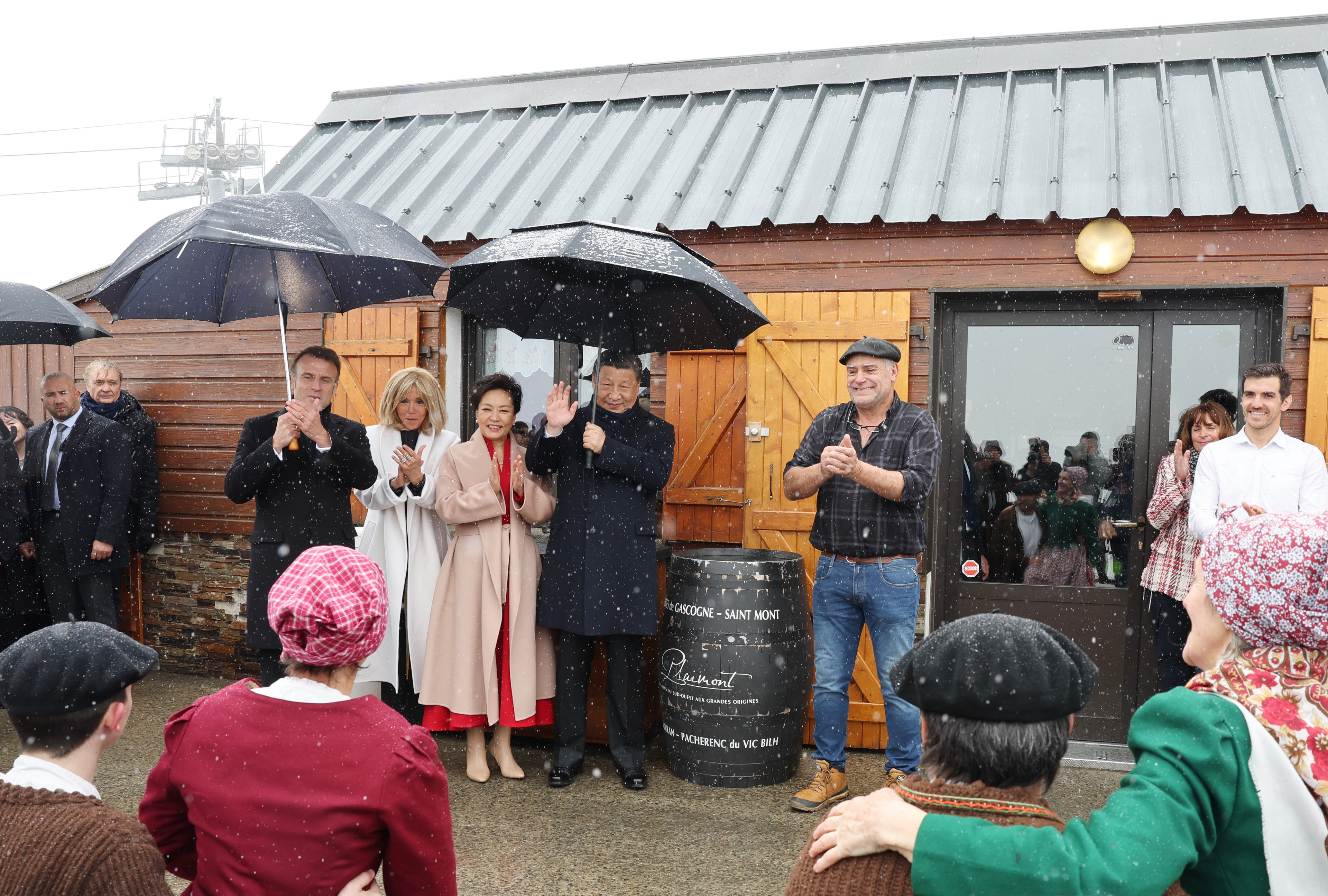 當?shù)貢r間2024年5月7日,應法國總統(tǒng)馬克龍?zhí)貏e邀請,國家主席習近平乘專機來到法國西南部上比利牛斯省訪問。在圖爾馬萊山口“牧羊人驛站”,習近平和夫人彭麗媛同馬克龍和夫人布麗吉特共同欣賞當?shù)卮迕癖硌莸木哂袧庥裟戏L情的牧羊人之舞。新華社記者 姚大偉 攝