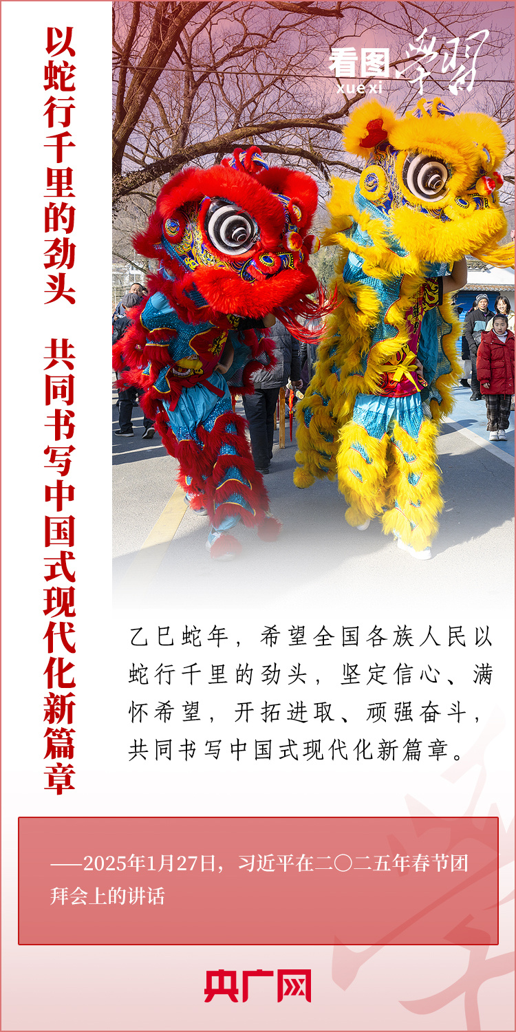 1月27日,中共中央、國(guó)務(wù)院在北京舉行春節(jié)團(tuán)拜會(huì),習(xí)近平總書(shū)記發(fā)表熱情洋溢的講話,向全國(guó)各族人民、港澳臺(tái)同胞、海外僑胞拜年并致以新春祝福??倳?shū)記在講話中深情回顧過(guò)去一年中國(guó)式現(xiàn)代化取得很不平凡的發(fā)展歷程,“希望全國(guó)各族人民以蛇行千里的勁頭,堅(jiān)定信心、滿懷希望,開(kāi)拓進(jìn)取、頑強(qiáng)奮斗,共同書(shū)寫中國(guó)式現(xiàn)代化新篇章?!币黄饋?lái)學(xué)習(xí)!