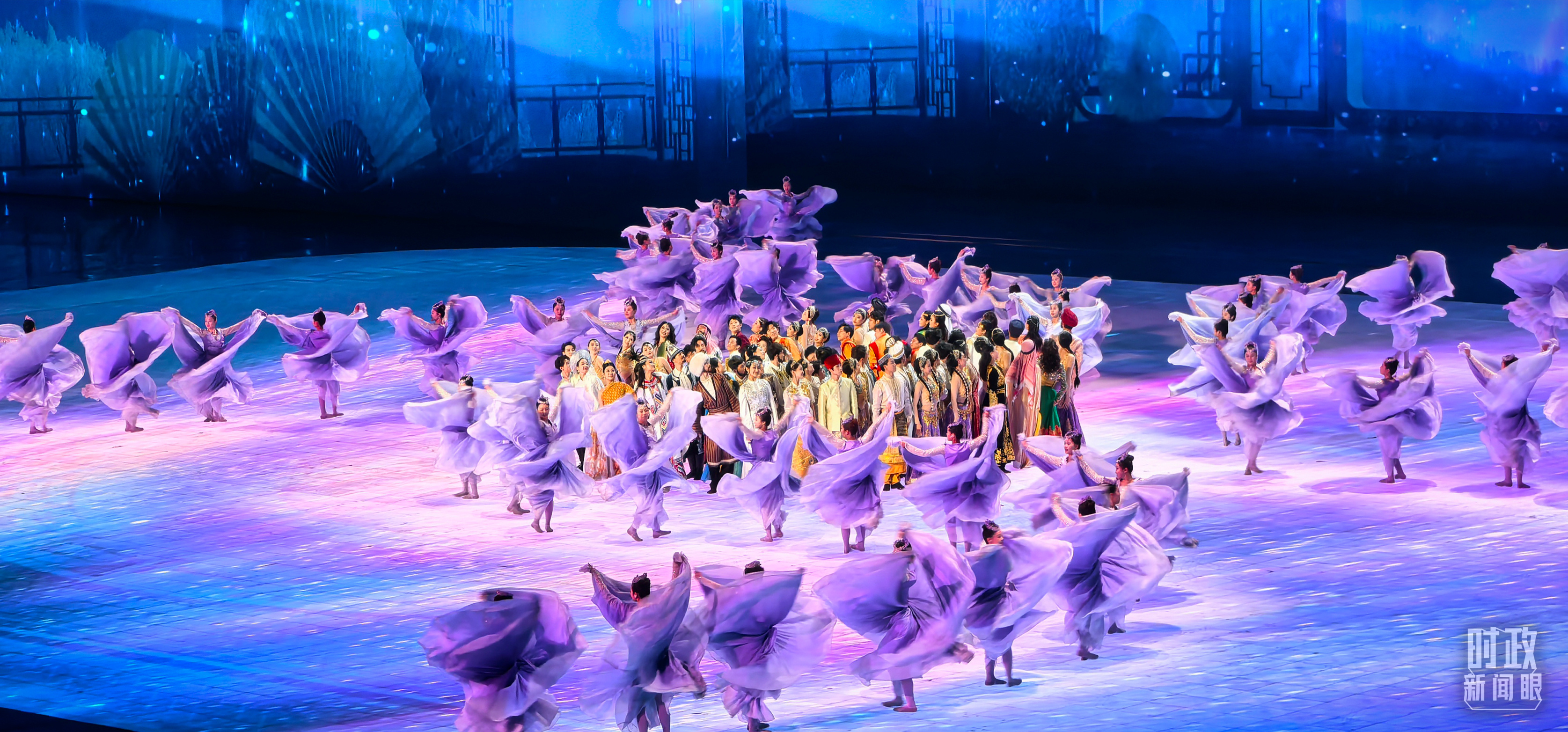 文藝表演分為上篇《熾熱冰雪》、中篇《燃情時(shí)速》、下篇《山高水長(zhǎng)》,通過《長(zhǎng)歌頌冰河》《榮光耀未來》《馳騁天地間》《璀璨嘉年華》《攜手情久長(zhǎng)》《萬里共和鳴》等節(jié)目,展現(xiàn)化“極寒”為“極美”“極燃”“極暖”的意蘊(yùn)。