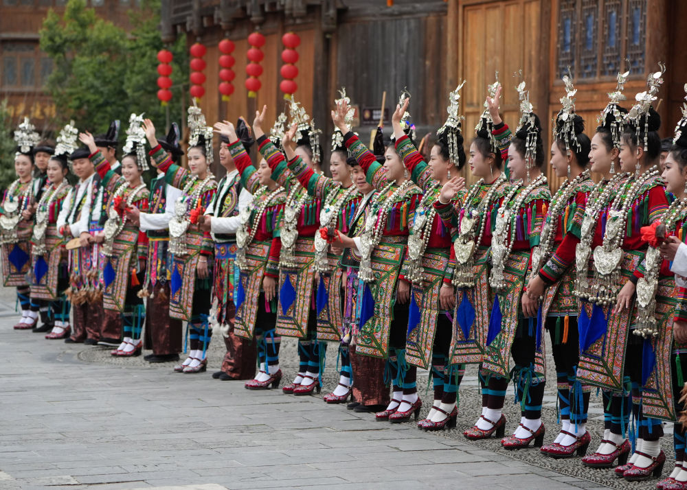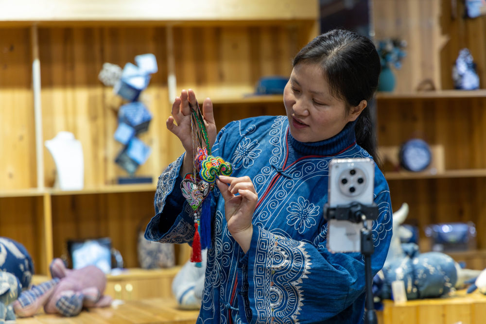 2025年3月14日,村民在肇興侗寨內(nèi)通過手機(jī)直播銷售刺繡作品。侗繡承載著侗族人的信仰與記憶,年輕繡娘的手藝多半來(lái)自母親傳承,侗族婦女用一針一線將民族古老的神話傳說、歷史風(fēng)俗記錄在服飾的紋樣里,讓這門手藝在侗鄉(xiāng)世代傳承。2011年,侗族刺繡被列入國(guó)家級(jí)非物質(zhì)文化遺產(chǎn)名錄。