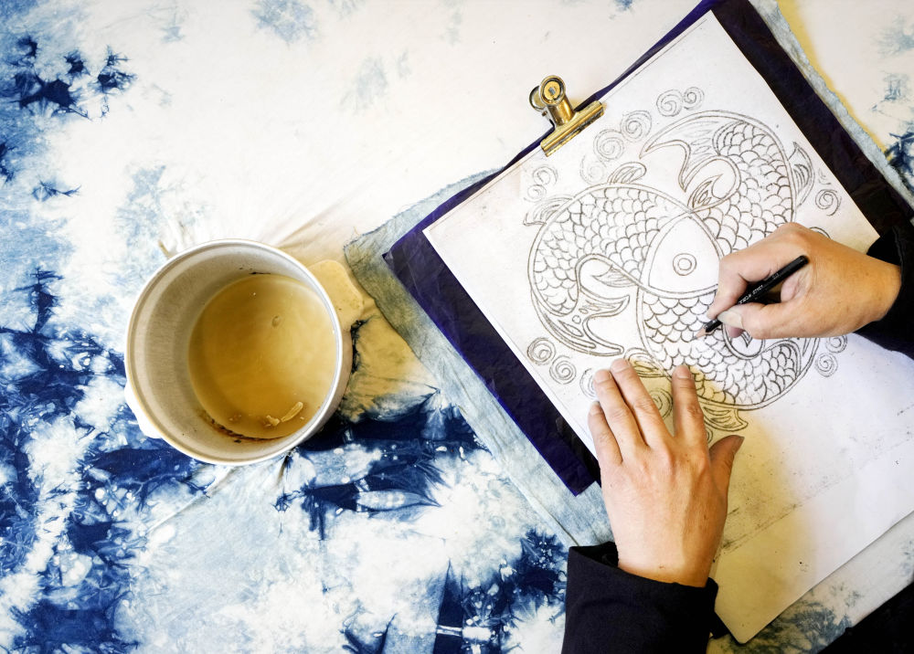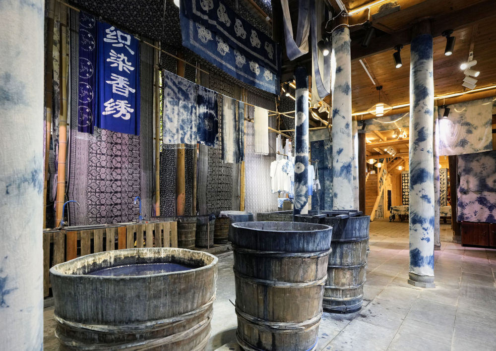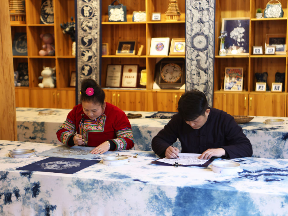 2025年3月14日,村民在肇興侗寨內(nèi)制作蠟染。近年來(lái),當(dāng)?shù)丶哟髮?duì)少數(shù)民族非遺文創(chuàng)產(chǎn)品的研發(fā)和創(chuàng)新力度,同時(shí)進(jìn)一步加強(qiáng)線上銷售,通過微信、網(wǎng)上直播、網(wǎng)店等方式進(jìn)行帶貨,讓當(dāng)?shù)厝罕娡ㄟ^指尖增收致富。