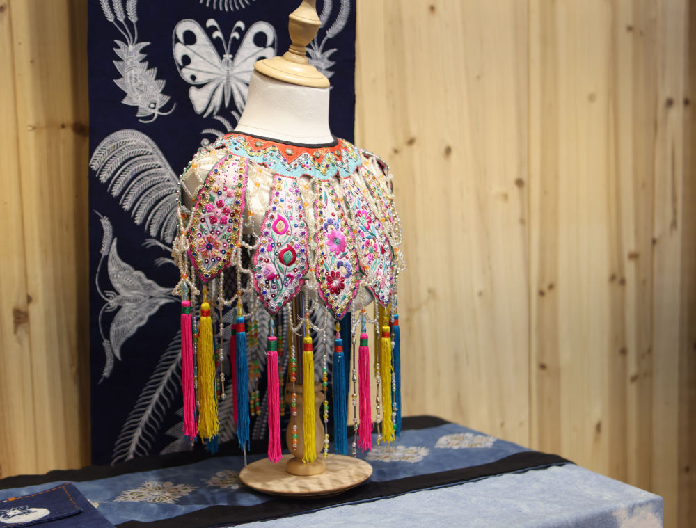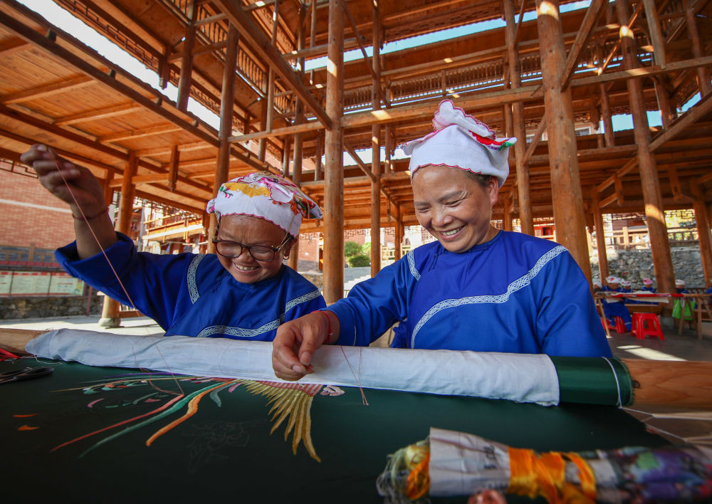 2021年9月27日,貴州省鎮(zhèn)遠(yuǎn)縣報(bào)京鄉(xiāng)報(bào)京村村民邰木香(右)在制作侗繡。邰木香將侗族的民間故事以刺繡形式展現(xiàn)出來(lái),還先后開發(fā)出傳統(tǒng)與現(xiàn)代相結(jié)合的侗族服飾、工藝包、繡花鞋、圍腰、頭巾、枕巾等系列產(chǎn)品,深受國(guó)內(nèi)外客商的青睞,致富的同時(shí)帶動(dòng)當(dāng)?shù)?00多名繡娘實(shí)現(xiàn)就業(yè)增收。