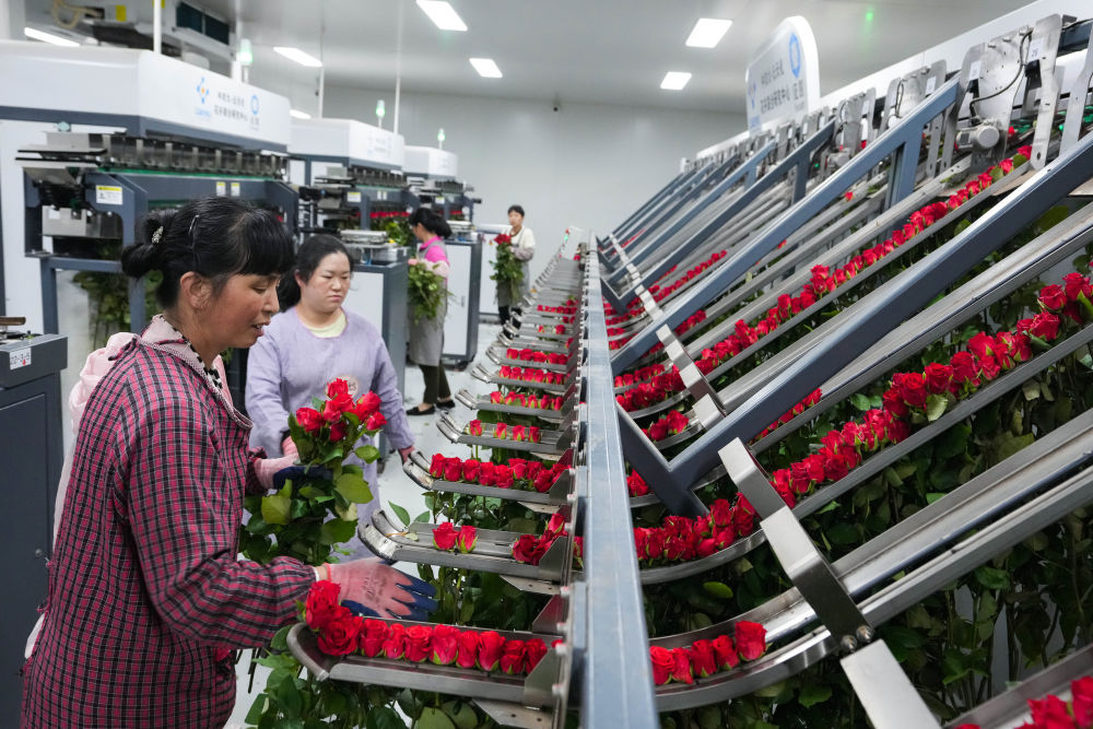 2024年8月23日,在云南晉寧花卉產(chǎn)業(yè)現(xiàn)代化示范園采后處理中心,花農(nóng)將鮮切花自動分揀流水線上分揀好的鮮花取下,準(zhǔn)備放入包裝流水線。