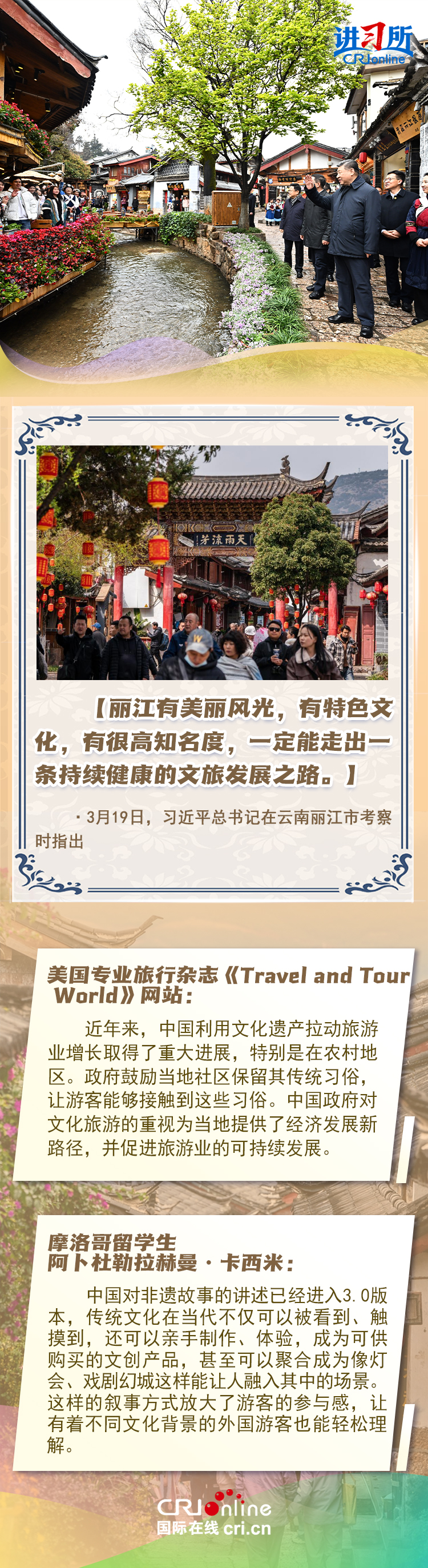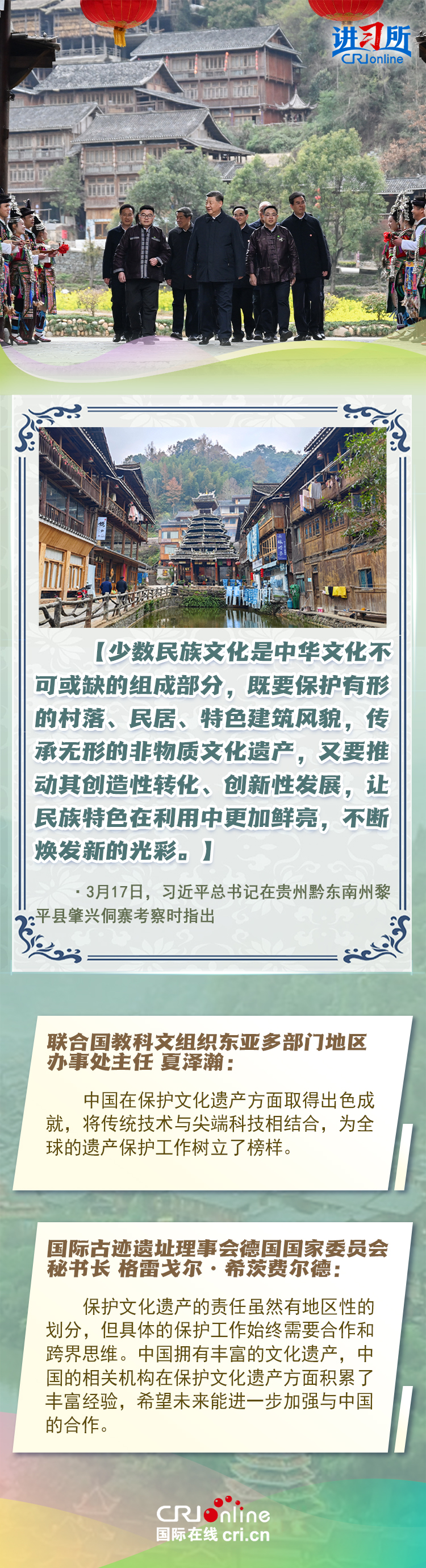 習(xí)近平總書記近日赴貴州、云南考察。他走進(jìn)民族特色村寨、歷史文化古城,心系歷史文化遺產(chǎn)保護(hù)和文旅融合發(fā)展。習(xí)近平特別叮囑當(dāng)?shù)毓賳T和群眾,既要保護(hù)有形的村落、民居、特色建筑風(fēng)貌,傳承無(wú)形的非物質(zhì)文化遺產(chǎn),又要推動(dòng)其創(chuàng)造性轉(zhuǎn)化、創(chuàng)新性發(fā)展。