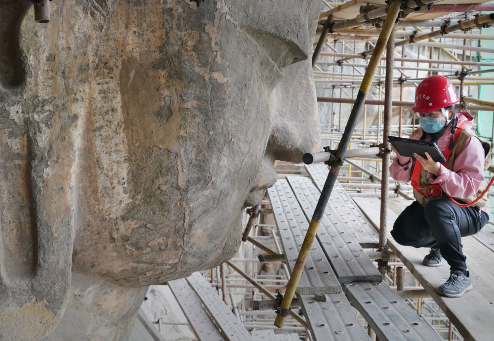 奉先寺位于河南洛陽龍門西山南段,是龍門石窟開鑿規(guī)模最大、最具代表性的摩崖像龕。2022年7月,龍門石窟奉先寺大型滲漏水治理和危巖體加固保護(hù)工程完工。這是工作人員在龍門石窟奉先寺進(jìn)行勘測(cè)作業(yè)(2022年4月14日攝)。