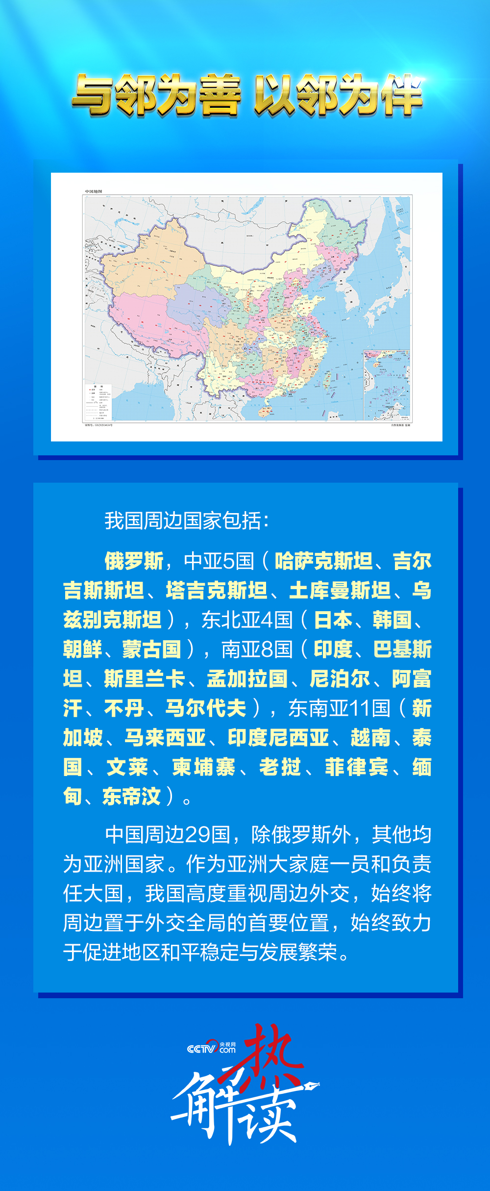 2013年10月,在新中國成立以來召開的首次周邊外交工作座談會上,習近平主席深刻指出,無論從地理方位、自然環(huán)境還是相互關(guān)系看,周邊對我國都具有極為重要的戰(zhàn)略意義。在那次會議上,習主席明確提出我國周邊外交基本方針——堅持與鄰為善、以鄰為伴,堅持睦鄰、安鄰、富鄰,突出體現(xiàn)親、誠、惠、容的理念。