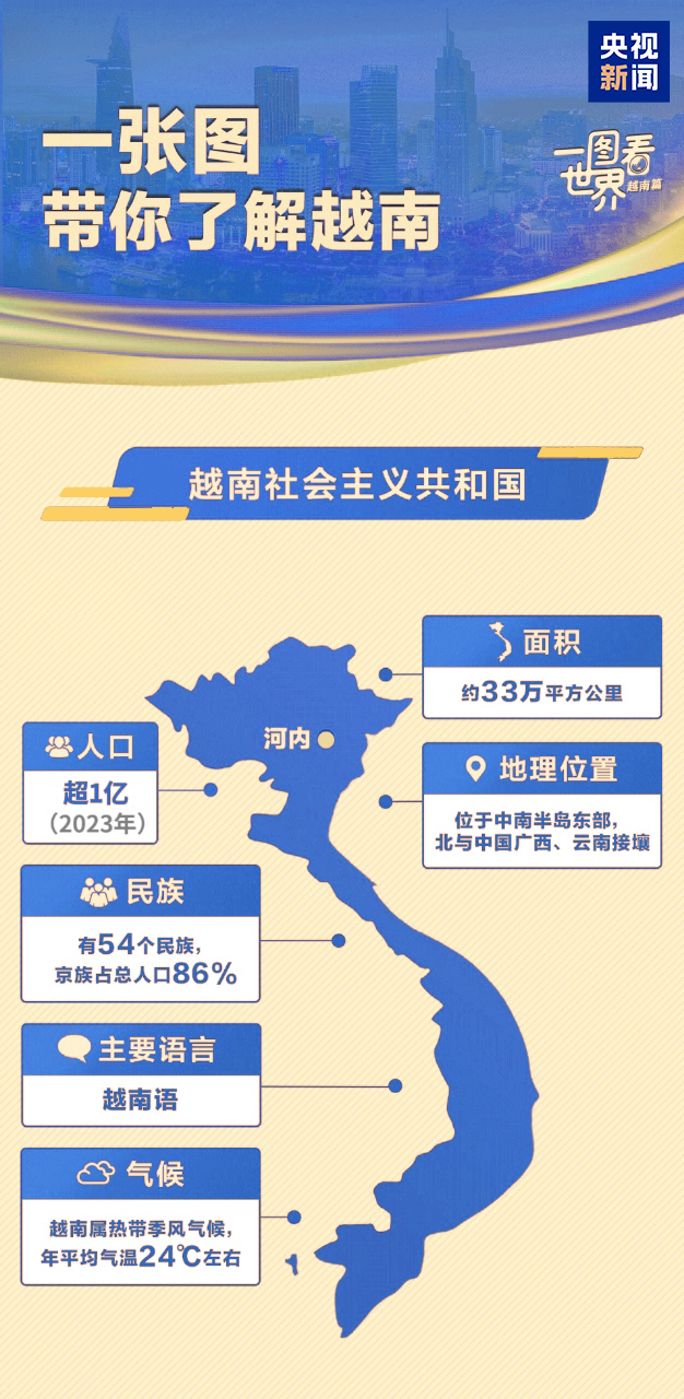 這里與華夏大地山水相依,兩國人民“共飲一江水,早相見、晚相望”。75載悠悠歲月里,中越情誼早已超越地理上的毗鄰,成為常來常往的好鄰居、好朋友、好同志、好伙伴。讓我們跟隨習主席的步伐,去這個親如手足的鄰居家串個門。