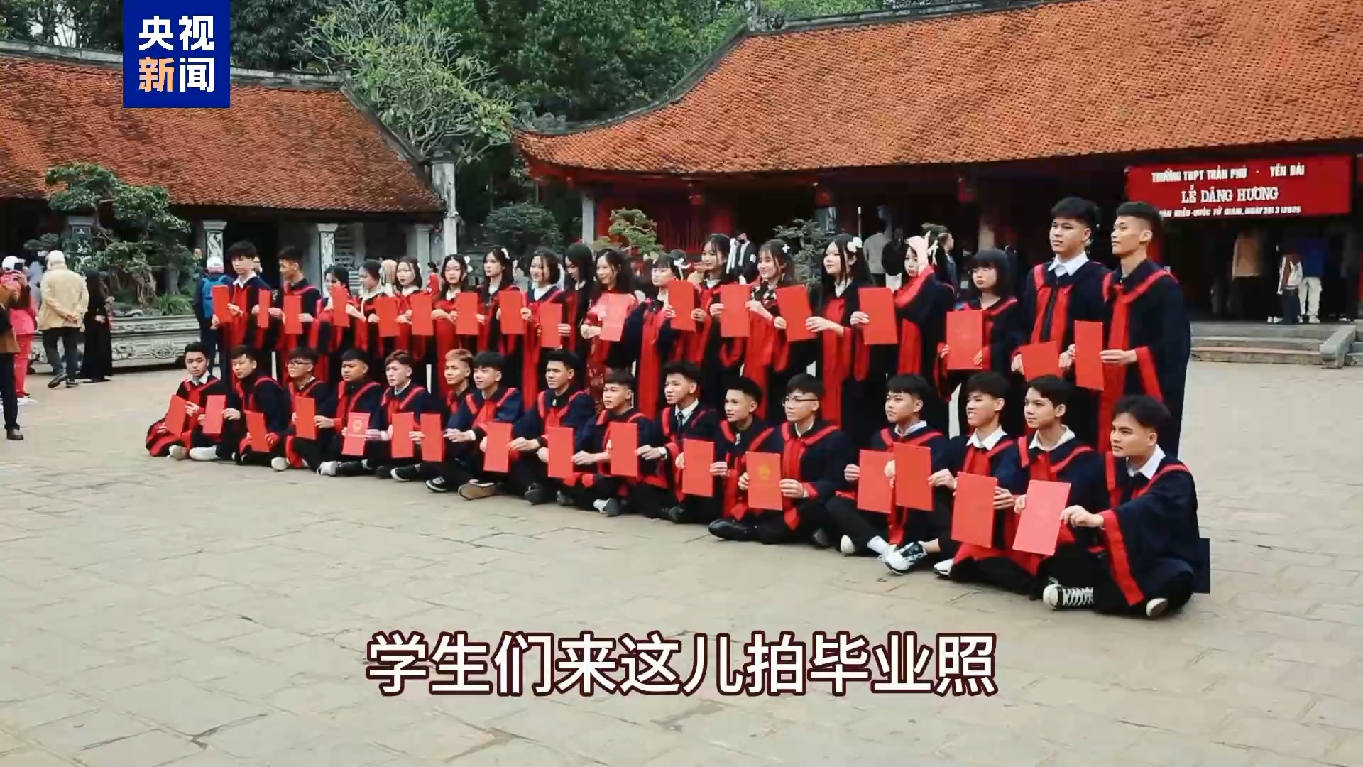 越南女學生:因為這里是一個神圣的地方,學生們來這兒拍畢業(yè)照,大家來文廟祭拜,希望能取得更好的學習成績。