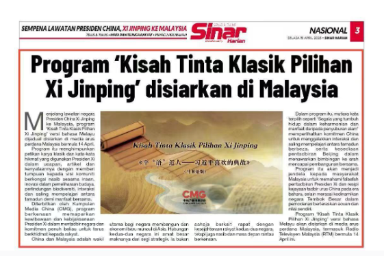 4月15日,馬來西亞中文、英文、馬來文主流媒體《星洲日報》《星報》《陽光日報》分別刊發(fā)節(jié)目在馬來西亞落播的消息。文章指出,《平“語”近人——習(xí)近平喜歡的典故》(馬來語版)特別選取了“萬物各得其和以生,各得其養(yǎng)以成”等典故,生動闡釋中國堅持不同文明之間平等交流、互學(xué)互鑒,愿意為人類破解時代難題、實(shí)現(xiàn)共同發(fā)展提供強(qiáng)大的精神指引,有助于馬來西亞民眾更好讀懂新時代中國之治的成功密碼,感知中國式現(xiàn)代化蓬勃發(fā)展的強(qiáng)勁脈動。