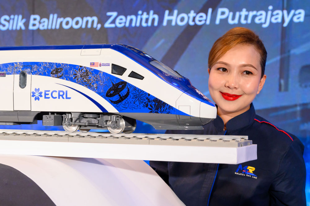 2024年12月18日,在馬來西亞普特拉賈亞,模特與新的動車組模型合影。新華社發(fā)(張紋綜 攝)