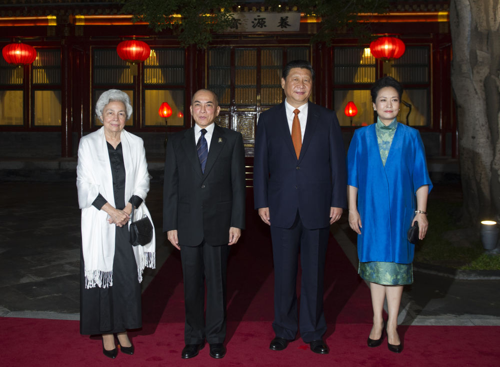 2014年9月25日晚,國(guó)家主席習(xí)近平在北京釣魚臺(tái)國(guó)賓館會(huì)見柬埔寨國(guó)王西哈莫尼和太后莫尼列。習(xí)近平主席夫人彭麗媛參加會(huì)見。