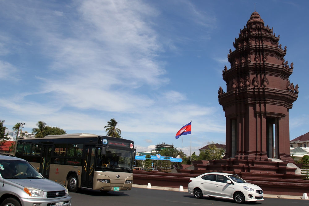 2018年1月5日,在柬埔寨金邊,一輛中國(guó)援助的“宇通”公交車經(jīng)過獨(dú)立紀(jì)念碑。