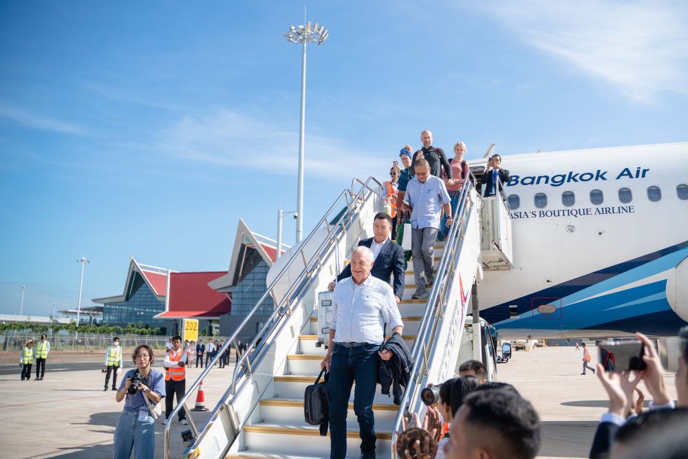 2023年10月16日,由中國(guó)企業(yè)在海外以“BOT模式(建設(shè)-運(yùn)營(yíng)-移交)”建設(shè)的柬埔寨暹粒吳哥國(guó)際機(jī)場(chǎng)通航運(yùn)營(yíng)。這是該機(jī)場(chǎng)首架進(jìn)港客機(jī)乘客走下飛機(jī)。