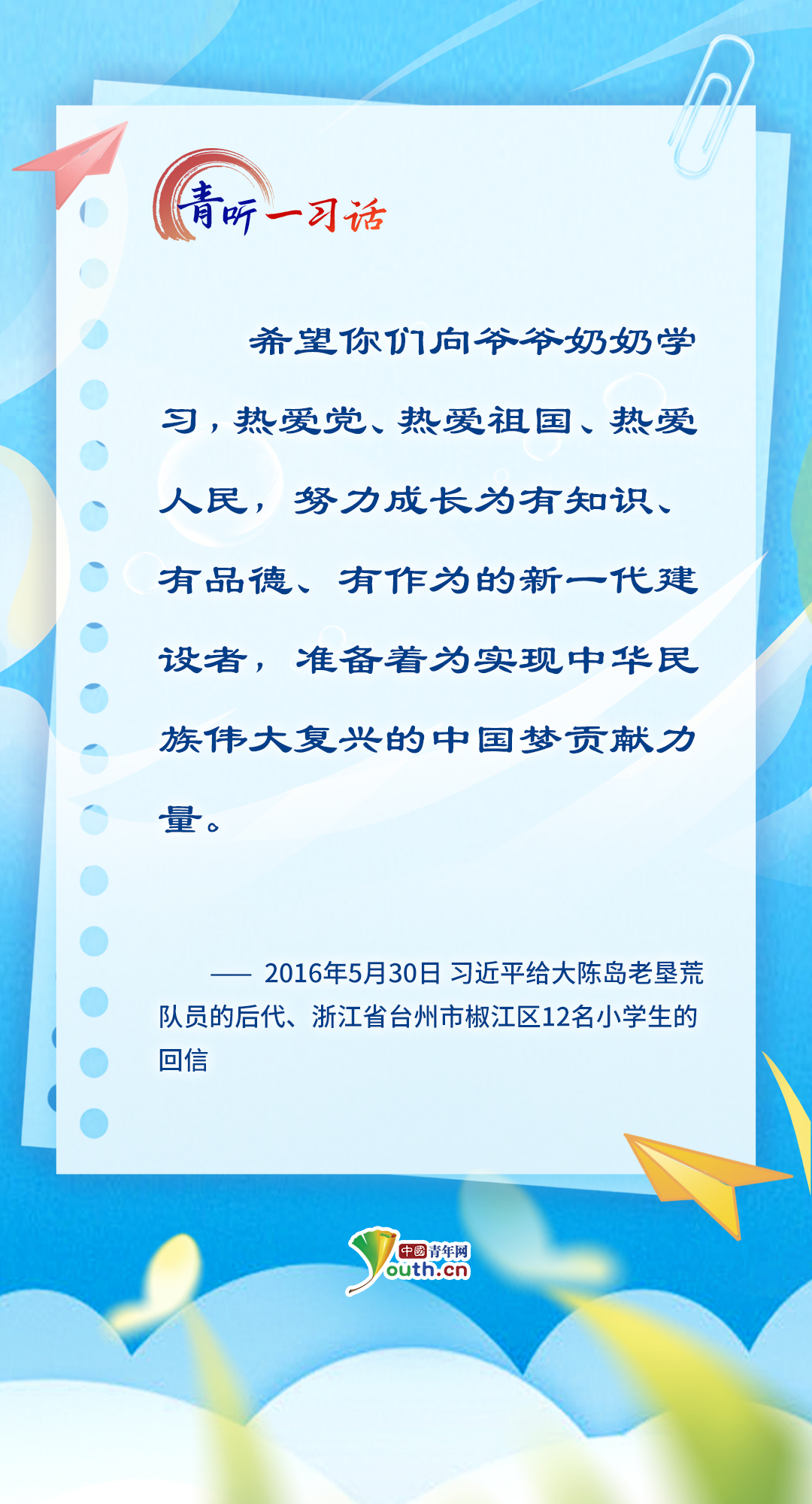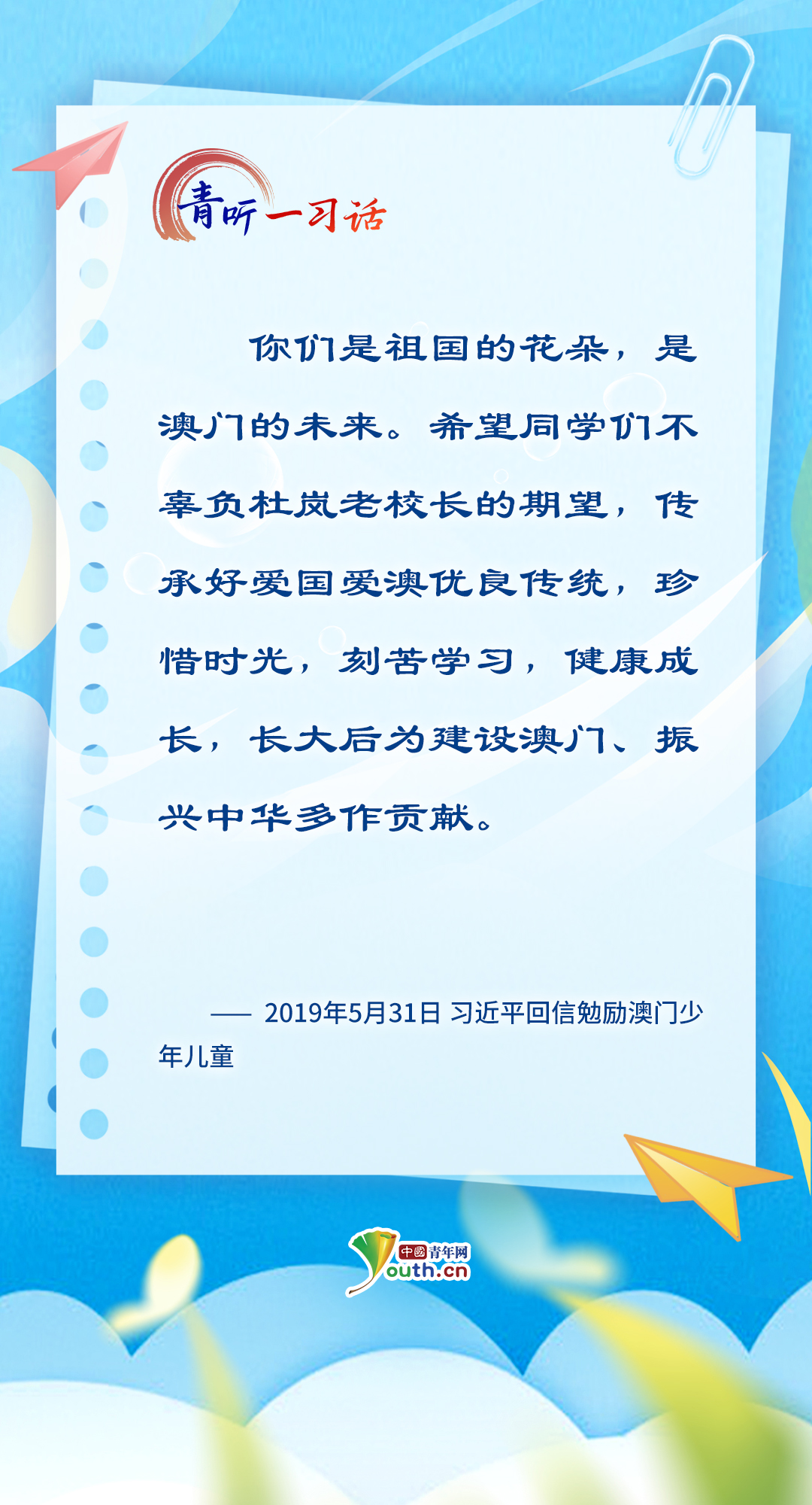 “孩子們成長(zhǎng)得更好,是我們最大的心愿?!秉h的十八大以來,習(xí)近平總書記關(guān)心關(guān)愛少年兒童成長(zhǎng)成才,為少先隊(duì)工作指明前進(jìn)方向,從“六一”國(guó)際兒童節(jié)的殷殷寄語,到外出考察時(shí)的點(diǎn)滴關(guān)懷……少年兒童的健康成長(zhǎng)和全面發(fā)展,一直是總書記心中最溫柔的牽掛。在今年“六一”國(guó)際兒童節(jié)到來之際,讓我們一起重溫總書記對(duì)少年兒童的諄諄教誨、美好祝愿,感受總書記對(duì)少年兒童的深情牽掛、殷切期望。(海報(bào)制作:張潔)