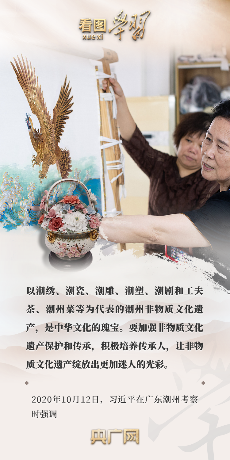 從古典民族史詩《格薩(斯)爾》到潮繡、潮瓷、潮劇和工夫茶,再到漢中藤編、常德絲弦……在各地考察調(diào)研時(shí),習(xí)近平總書記曾多次就文化傳承發(fā)展、非物質(zhì)文化遺產(chǎn)保護(hù)作出重要指示,強(qiáng)調(diào)要“讓非物質(zhì)文化遺產(chǎn)綻放出更加迷人的光彩”。