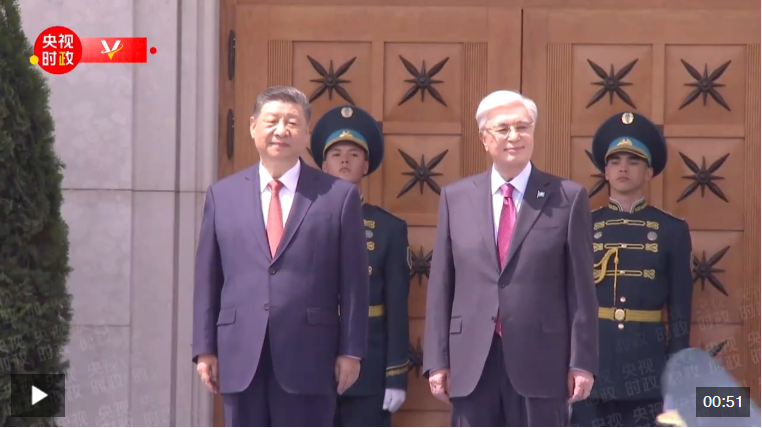 習(xí)近平抵達(dá)阿斯塔納納扎爾巴耶夫國際機場時,托卡耶夫總統(tǒng)率總統(tǒng)辦公廳主任達(dá)杰拜、副總理兼外長努爾特列烏、總統(tǒng)外事顧問卡濟(jì)漢、阿斯塔納市長卡瑟姆別克等高級官員熱情迎接。身著盛裝的哈薩克斯坦女青年向習(xí)近平獻(xiàn)花。禮兵分列藍(lán)地毯兩側(cè)致敬,哈薩克斯坦少年兒童手持中哈兩國國旗熱烈歡迎習(xí)近平到訪。習(xí)近平在托卡耶夫陪同下觀看儀仗隊分列式,直升機懸掛中哈國旗從機場上空飛過。在機場貴賓樓內(nèi),兩國元首還共同欣賞哈薩克斯坦少年兒童的文藝表演。