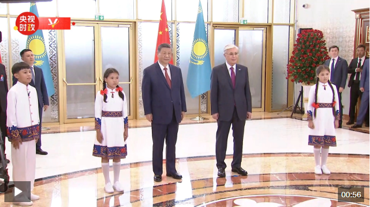習(xí)近平抵達(dá)阿斯塔納納扎爾巴耶夫國際機(jī)場(chǎng)時(shí),托卡耶夫總統(tǒng)率總統(tǒng)辦公廳主任達(dá)杰拜、副總理兼外長(zhǎng)努爾特列烏、總統(tǒng)外事顧問卡濟(jì)漢、阿斯塔納市長(zhǎng)卡瑟姆別克等高級(jí)官員熱情迎接。