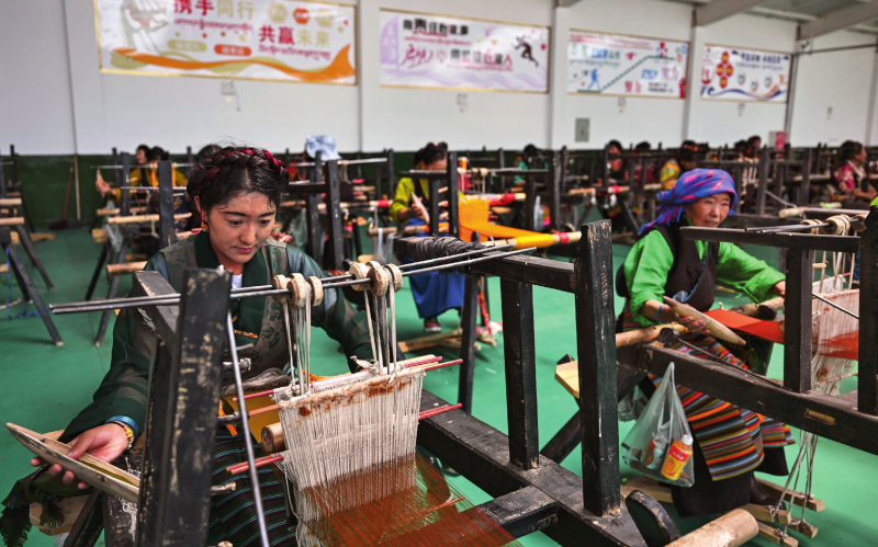 在西藏日喀則市仁布縣特色產(chǎn)業(yè)孵化園,亞德細(xì)褐羊毛織品農(nóng)民專(zhuān)業(yè)合作社工作人員在車(chē)間里織布(2024年9月1日攝)孫瑞博攝/本刊