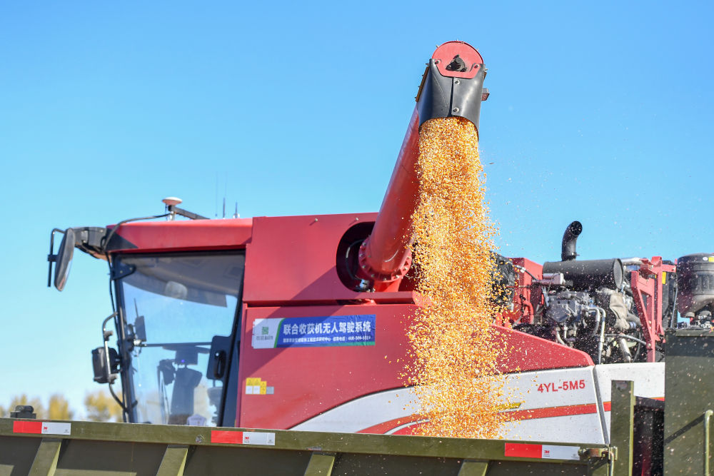 2023年10月19日,在中國(guó)科學(xué)院“黑土糧倉(cāng)”科技會(huì)戰(zhàn)長(zhǎng)春示范區(qū)公主嶺示范基地,無人駕駛農(nóng)機(jī)將收獲的玉米裝車。