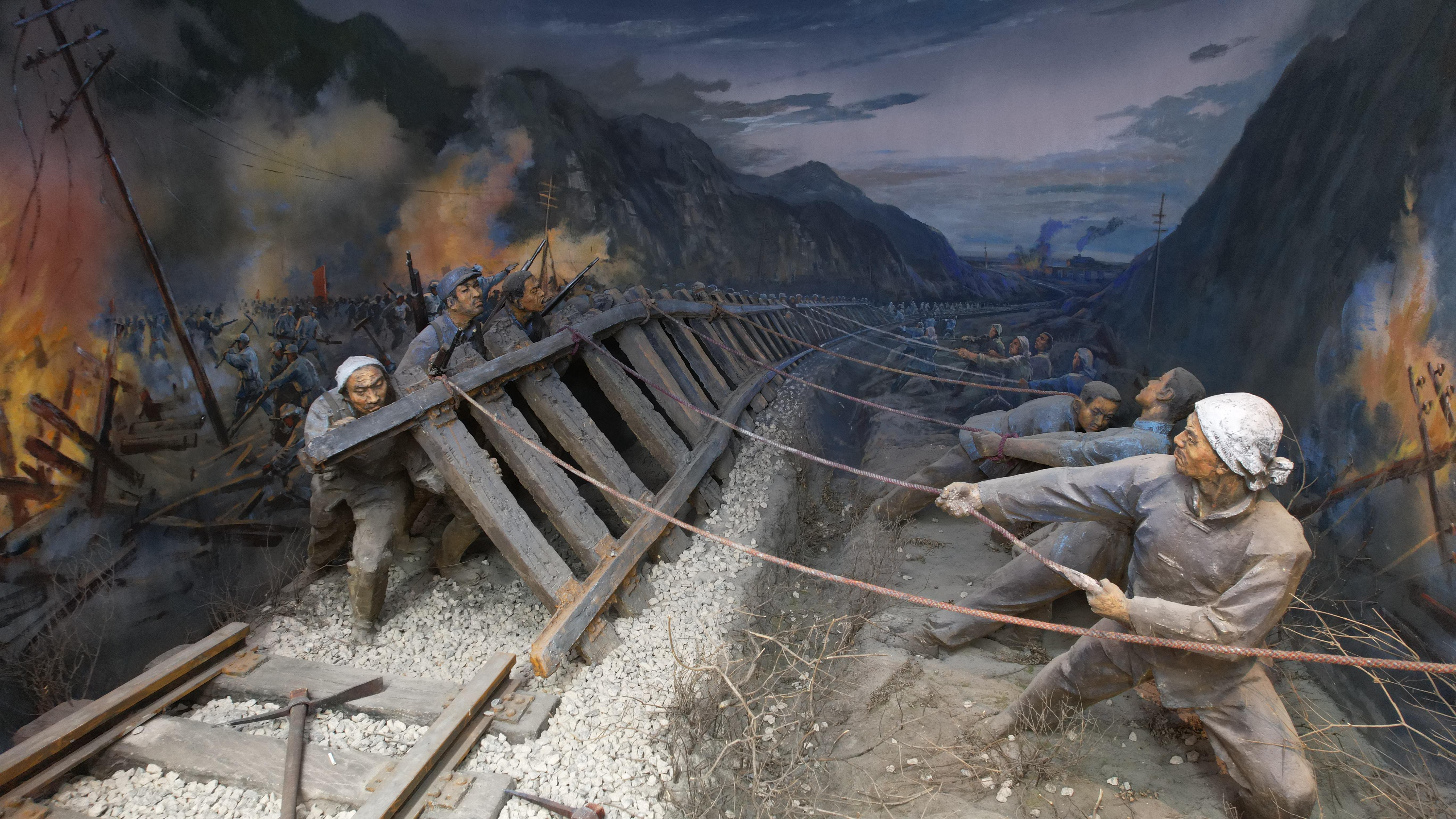 △百團(tuán)大戰(zhàn)紀(jì)念館內(nèi)展示的軍民掀翻鐵軌的場景。(總臺央視記者范凱、裴大偉拍攝)