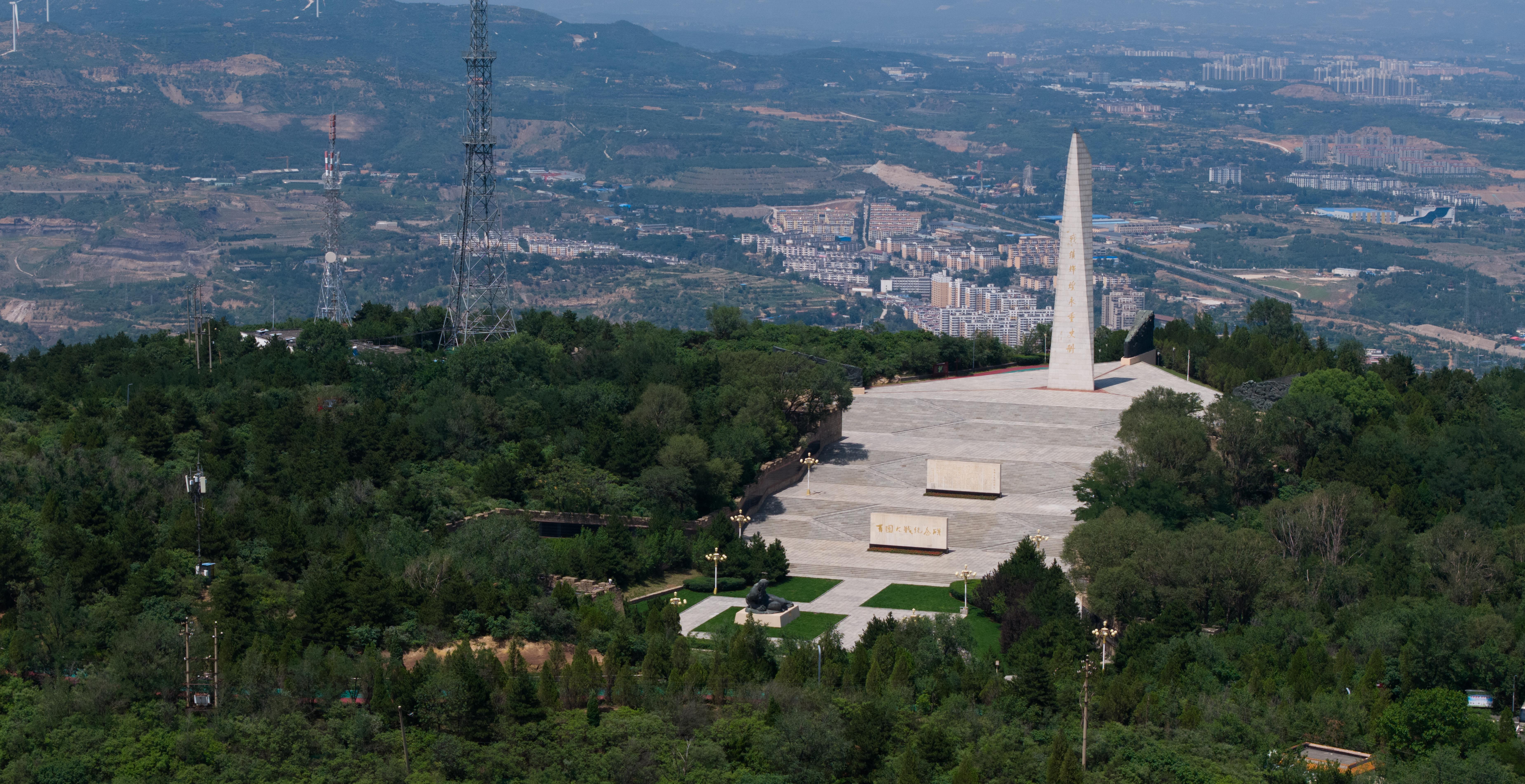 △獅腦山頂峰,百團(tuán)大戰(zhàn)紀(jì)念碑如一把鋒利的刺刀直插云霄。(總臺國廣記者李晉拍攝)