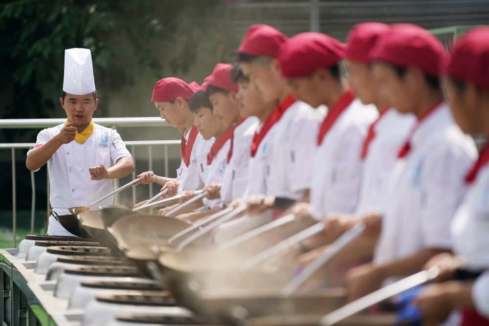 2023年6月25日,在位于西安市藍田縣的藍田廚師學校,教師指導學生們練習翻勺。藍田縣是著名的“廚師之鄉(xiāng)”。通過成立廚師學校,培養(yǎng)具有較高文化素養(yǎng)、藝術素養(yǎng)的一專多能的新一代廚師,藍田縣讓具有地方特色的職業(yè)教育拓展就業(yè)渠道,助力鄉(xiāng)村振興。