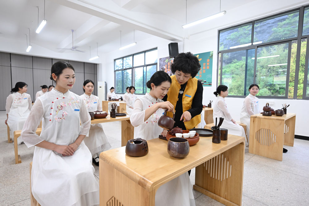 2025年5月8日,福建省武夷山旅游職業(yè)中專學校的茶藝老師在教授茶藝。近年來,武夷山市依托當?shù)夭璁a業(yè)優(yōu)勢,持續(xù)推進茶文化、茶技能教育走進校園,在當?shù)芈殬I(yè)學校重點開設了茶藝、茶葉加工、茶營銷等專業(yè),為當?shù)夭璁a業(yè)發(fā)展、茶文化傳播培養(yǎng)職業(yè)技能人才。