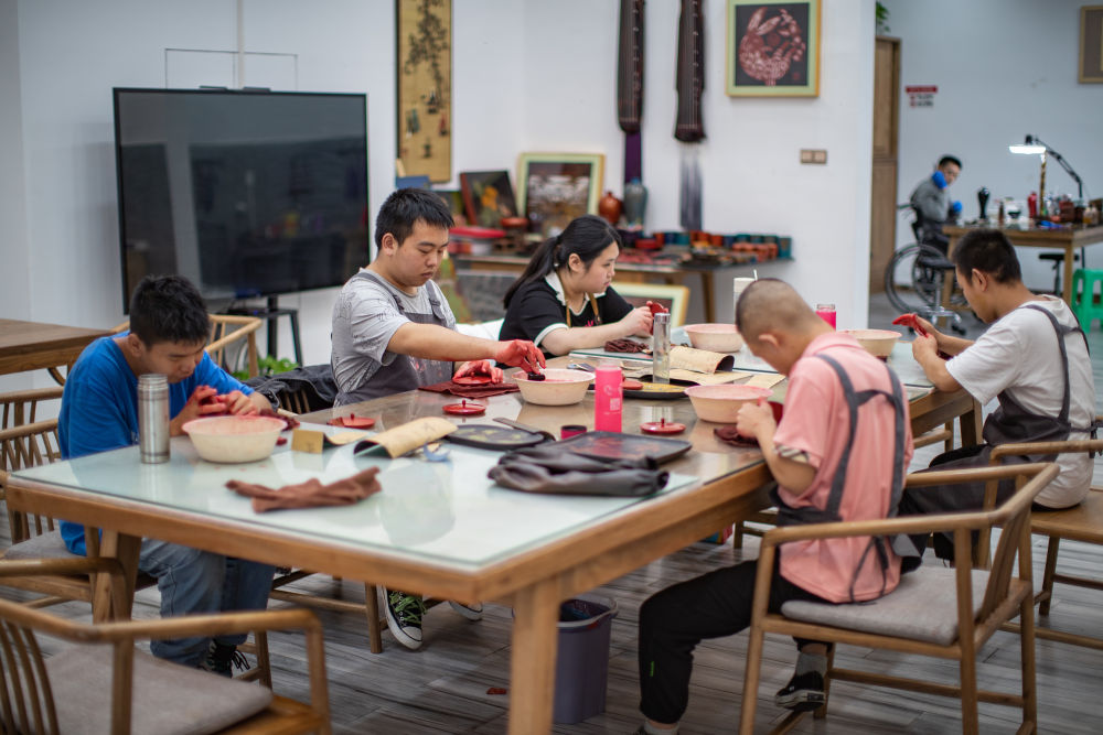 2023年9月18日,在重慶市城口縣的“忘我”大漆藝術空間,殘障員工打磨漆器產品?!巴摇贝笃崴囆g空間集殘疾人漆藝培訓、輔助性就業(yè)、職業(yè)康復、日間照料等功能于一體,利用當?shù)氐拇竽酒豳Y源,組織殘疾人創(chuàng)作漆器產品。