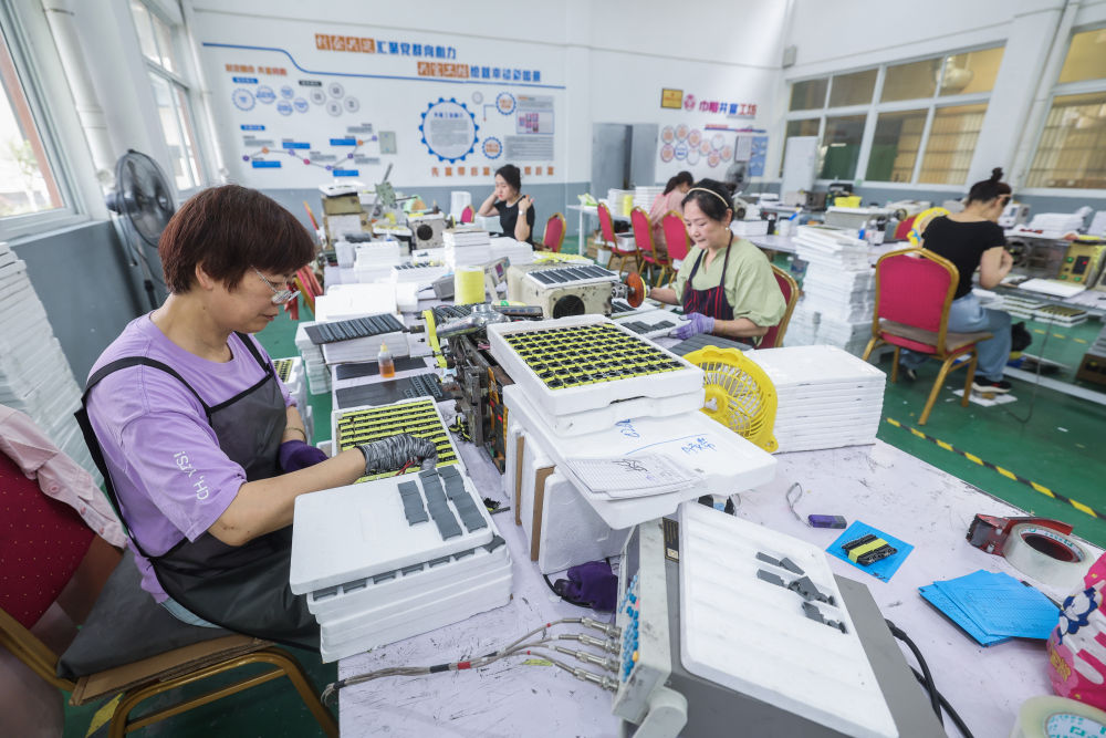 2025年6月19日,村民在浙江省海寧市鹽官鎮(zhèn)桃園村紅“芯”共富工坊內工作。該共富工坊針對有靈活就業(yè)需求的低收入村民,采用“靈活就業(yè)+固定用工”彈性用工方式,促進群眾就業(yè)增收。