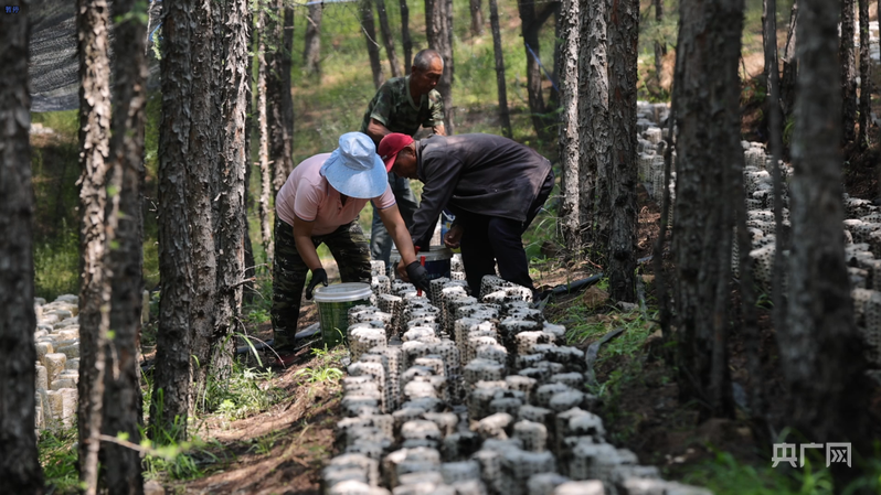 村民在馬鞍山林場林下經(jīng)濟試驗示范基地采摘木耳(央廣網(wǎng)發(fā) 劉德胤 攝)