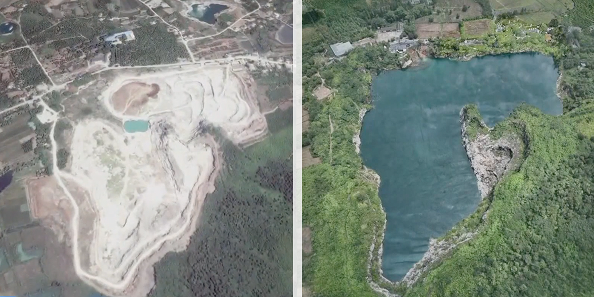 浙江安吉曾經(jīng)最大的石灰?guī)r礦坑復綠改造后,變成有山有水的生態(tài)度假區(qū)。