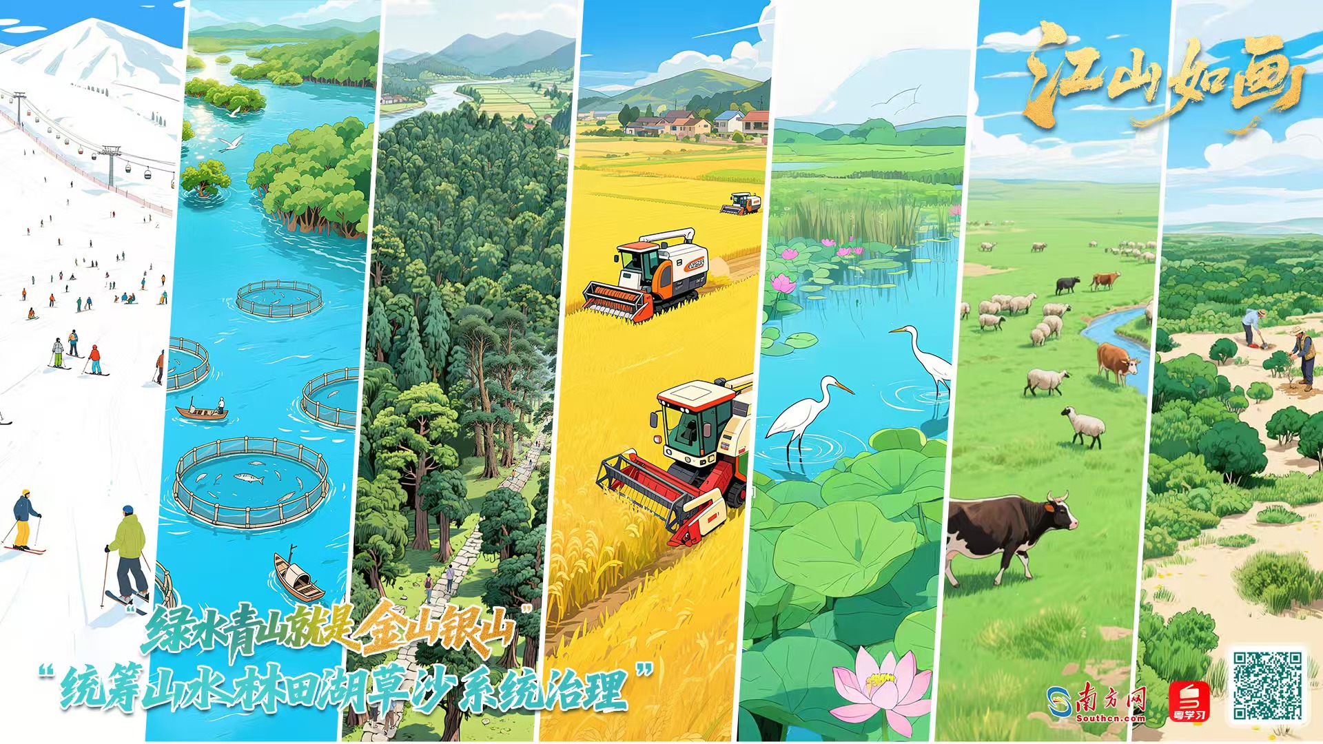 南方網(wǎng)、粵學(xué)習(xí)客戶端策劃制作“兩山”理念提出20周年紀(jì)念長(zhǎng)卷——《江山如畫》,選取習(xí)近平總書記曾實(shí)地考察過(guò)的湛江紅樹林、白洋淀、青藏高原等80余個(gè)地點(diǎn),沿海拔線一路攀升,描繪新時(shí)代“山水林田湖草沙一體化保護(hù)和系統(tǒng)治理”的生態(tài)文明建設(shè)新圖景。同步嵌入“習(xí)近平生態(tài)文明思想文庫(kù)”,立體呈現(xiàn)我國(guó)生態(tài)文明建設(shè)理論與實(shí)踐不斷深化、辯證統(tǒng)一的過(guò)程。