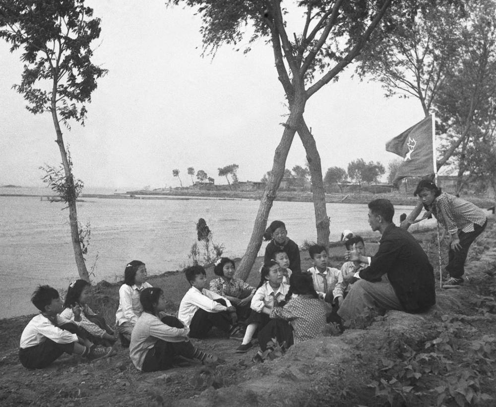 1955年,在河北白洋淀,新安小學(xué)的少先隊(duì)員們聽(tīng)曾擔(dān)任過(guò)抗戰(zhàn)時(shí)期兒童團(tuán)團(tuán)長(zhǎng)的陳殿元講抗戰(zhàn)故事。