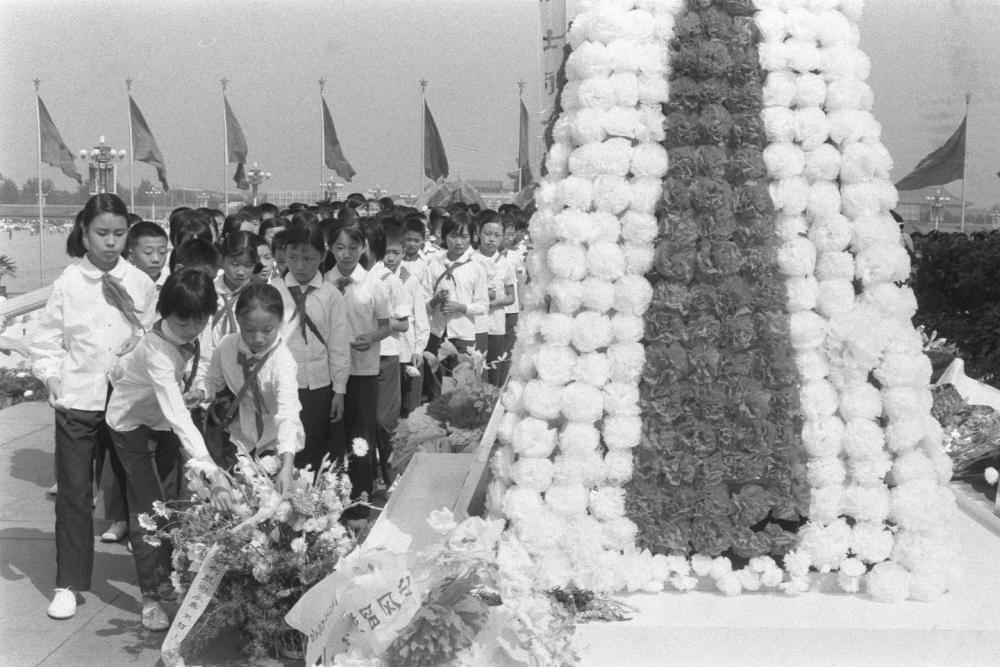 1985年,首都各界代表在天安門(mén)廣場(chǎng)人民英雄紀(jì)念碑前舉行獻(xiàn)花圈儀式,追念在抗日戰(zhàn)爭(zhēng)中犧牲的將士和死難同胞。這是海淀區(qū)少先隊(duì)員在敬獻(xiàn)花圈。